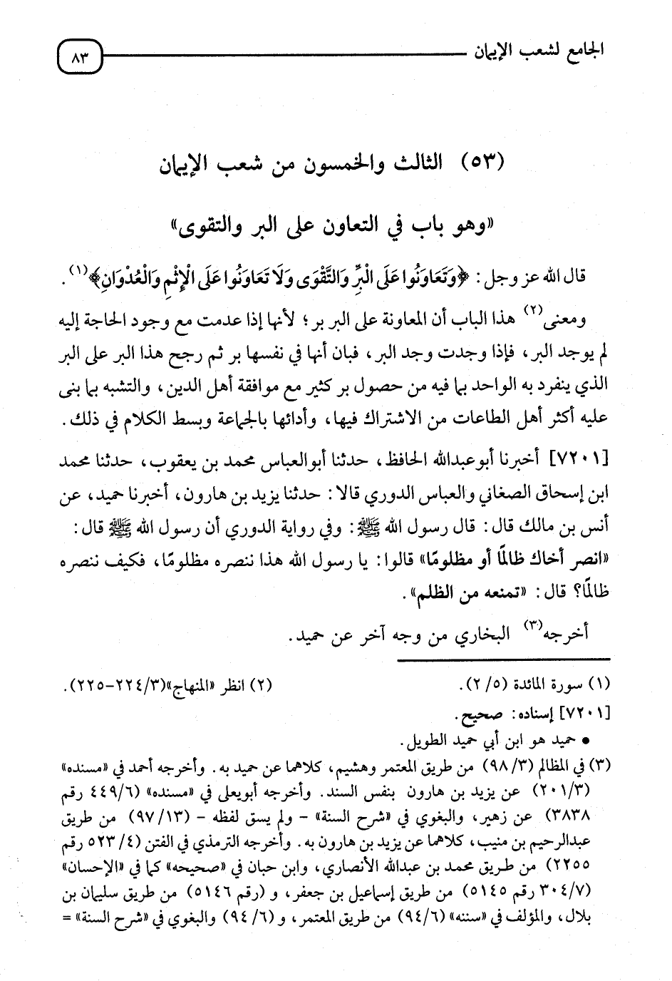 §الثَّالِثُ وَالْخَمْسُونَ مِنْ شُعَبُ الْإِيمَانِ، وَهُوَ بَابٌ فِي التَّعَاوُنِ عَلَى الْبِرِّ وَالتَّقْوَى " قَالَ اللهُ عَزَّ وَجَلَّ: {وَتَعَاوَنُوا عَلَى الْبِرِّ وَالتَّقْوَى، وَلَا تَعَاوَنُوا عَلَى الْإِثْمِ وَالْعُدْوَانِ} [المائدة: 2]، وَمَعْنَى هَذَا الْبَابِ أَنَّ الْمُعَاوَنَةَ عَلَى الْبِرِّ بِرٌّ، لِأَنَّهَا إِذَا عُدِمَتْ مَعَ وُجُودِ الْحَاجَةِ إِلَيْهِ لَمْ يُوجَدِ الْبِرُّ، وَإِذَا أُوجِدَتْ وُجِدَ الْبِرُّ، فَبَانَ بِأَنَّهَا فِي نَفْسِهَا بِرٌّ، ثُمَّ رَجَحَ هَذَا الْبِرُّ عَلَى الْبِرِّ الَّذِي يَنْفَرِدُ بِهِ الْوَاحِدُ بِمَا فِيهِ مِنْ حُصُولِ بِرٍّ كَثِيرٍ مَعَ مُوَافَقَةِ أَهْلِ الدِّينِ، وَالتَّشَبُّهِ بِمَا بُنِيَ عَلَيْهِ أَكْثَرُ الطَّاعَاتِ، مِنَ الِاشْتِرَاكِ فِيهَا، وَأَدَائِهَا بِالْجَمَاعَةِ، وَبَسَطَ الْكَلَامَ فِي ذَلِكَ "