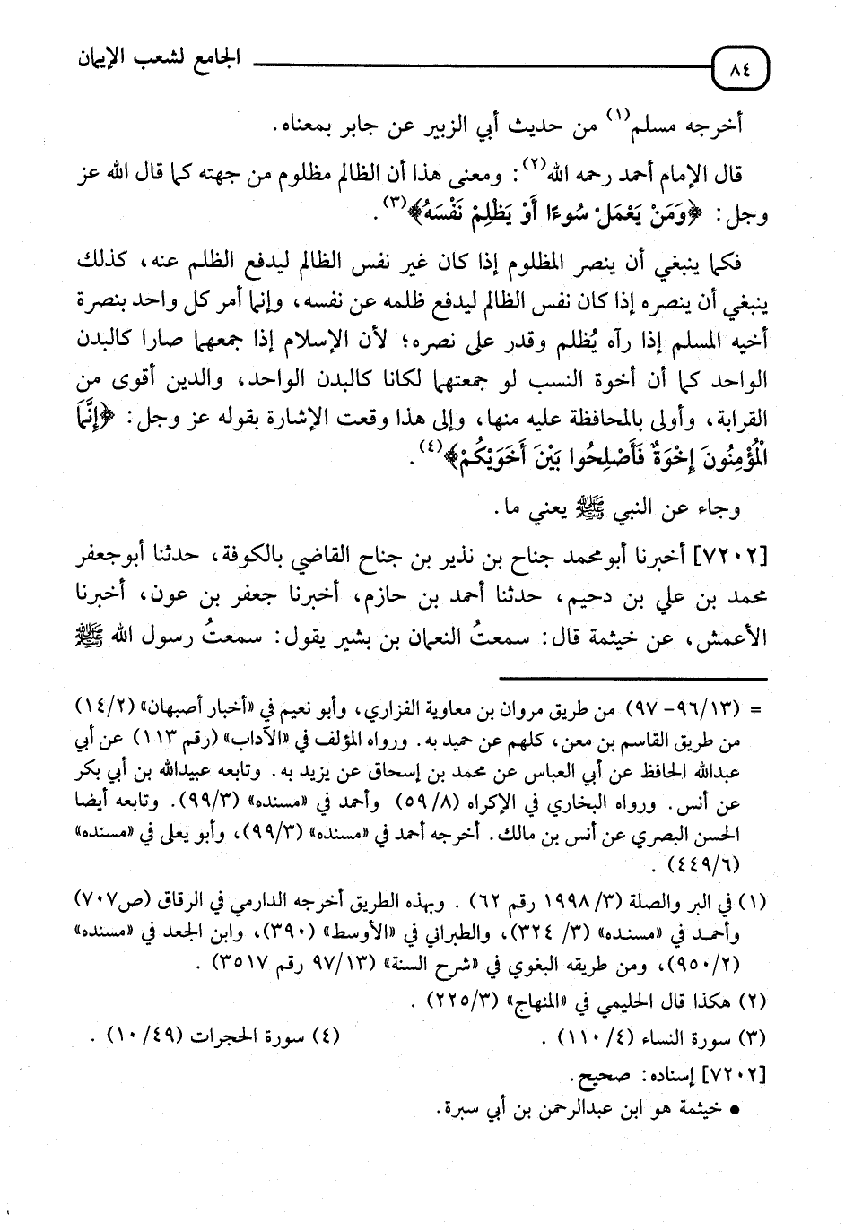 7202 - أَخْبَرَنَا أَبُو مُحَمَّدٍ جَنَاحُ بْنُ نَذِيرِ بْنِ جَنَاحٍ الْقَاضِي بِالْكُوفَةِ، نا أَبُو جَعْفَرٍ مُحَمَّدُ بْنُ عَلِيِّ بْنِ دُحَيْمٍ، نا أَحْمَدُ بْنُ حَازِمٍ، أنا جَعْفَرُ بْنُ عَوْنٍ، أنا الْأَعْمَشُ، عَنْ خَيْثَمَةَ، قَالَ: سَمِعْتُ النُّعْمَانَ بْنَ بَشِيرٍ، يَقُولُ: سَمِعْتُ رَسُولَ اللهِ صَلَّى اللَّهُ عَلَيْهِ وَسَلَّمَ -[85]- يَقُولُ: " إِنَّمَا §الْمُؤْمِنُونَ مِثْلُ رَجُلٍ - أَوْ كَرَجُلٍ - وَاحِدٍ إِذَا اشْتَكَى عَيْنَاهُ اشْتَكَى كُلُّهُ، وَإِذَا اشْتَكَى رَأْسُهُ اشْتَكَى كُلُّهُ " أَخْرَجَهُ مُسْلِمٌ مِنْ وَجْهٍ آخِرَ، عَنِ الْأَعْمَشِ،