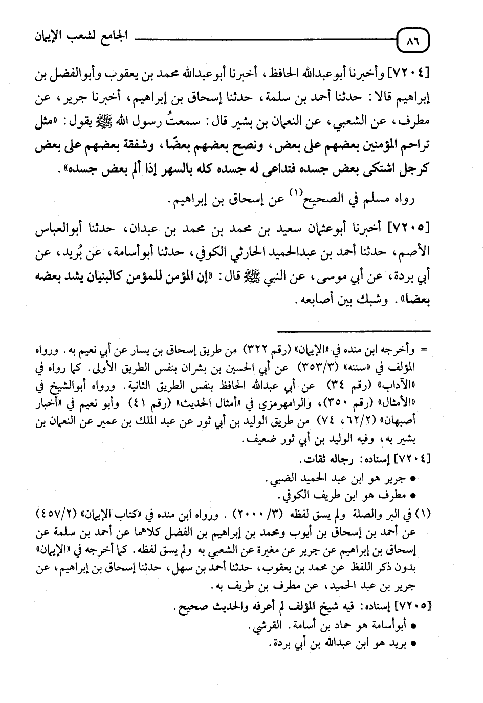7204 - وَأَخْبَرَنَا أَبُو عَبْدِ اللهِ الْحَافِظُ، أنا أَبُو عَبْدِ اللهِ مُحَمَّدُ بْنُ يَعْقُوبَ، وَأَبُو الْفَضْلِ بْنُ إِبْرَاهِيمَ، نا أَحْمَدُ بْنُ سَلَمَةَ، نا إِسْحَاقُ بْنُ إِبْرَاهِيمَ، أنا جَرِيرٌ، عَنْ مُطَرِّفٍ، عَنِ الشَّعْبِيِّ، عَنِ النُّعْمَانِ بْنِ بَشِيرٍ، قَالَ: سَمِعْتُ رَسُولَ اللهِ صَلَّى اللَّهُ عَلَيْهِ وَسَلَّمَ يَقُولُ: " §مَثَلُ تَرَاحُمِ الْمُؤْمِنِينَ بَعْضِهِمْ عَلَى بَعْضٍ، ونُصْحِ بَعْضِهِمْ بَعْضًا، وَشَفَقَةِ بَعْضِهِمْ عَلَى بَعْضٍ كَرَجُلٍ اشْتَكَى بَعْضُ جَسَدِهِ، فَتَدَاعَى لَهُ جَسَدُهُ كُلُّهُ بِالسَّهَرِ إِذْ أَلِمَ بَعْضُ جَسَدِهِ " رَوَاهُ مُسْلِمٌ فِي الصَّحِيحِ، عَنْ إِسْحَاقَ بْنِ إِبْرَاهِيمَ
