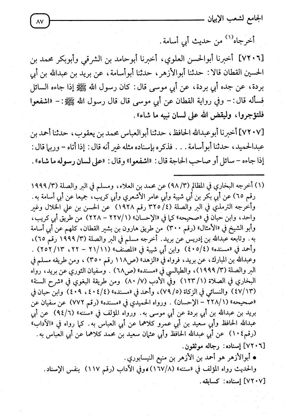 7206 - أَخْبَرَنَا أَبُو الْحَسَنِ الْعَلَوِيُّ، أنا أَبُو حَامِدِ بْنُ الشَّرْقِيِّ، وَأَبُو بَكْرٍ مُحَمَّدُ بْنُ الْحُسَيْنِ الْقَطَّانُ، قَالَا: نا أَبُو الْأَزْهَرِ، نا أَبُو أُسَامَةَ، عَنْ بُرَيْدِ بْنِ عَبْدِ اللهِ بْنِ أَبِي بُرْدَةَ، عَنْ جَدِّهِ أَبِي بُرْدَةَ، عَنْ أَبِي مُوسَى، قَالَ: كَانَ رَسُولُ اللهِ صَلَّى اللَّهُ عَلَيْهِ وَسَلَّمَ إِذَا جَاءَهُ السَّائِلُ - قَالَ: وَفِي رِوَايَةِ الْقَطَّانِ، عَنْ أَبِي مُوسَى - قَالَ: قَالَ رَسُولُ اللهِ صَلَّى اللَّهُ عَلَيْهِ وَسَلَّمَ: §" اشْفَعُوا فَلْتُؤْجَرُوا، وَلْيَقْضِ اللهُ عَلَى لِسَانِ نَبِيِّهِ مَا شَاءَ "