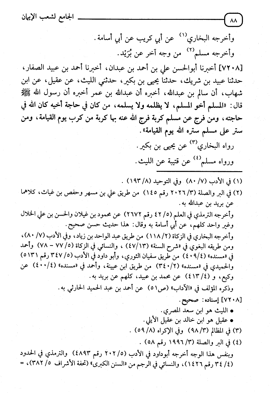 7208 - أَخْبَرَنَا أَبُو الْحَسَنِ عَلِيُّ بْنُ أَحْمَدَ بْنِ عَبْدَانَ، أنا أَحْمَدُ بْنُ عُبَيْدٍ الصَّفَّارُ، نا عُبَيْدُ بْنُ شَرِيكٍ، نا يَحْيَى بْنُ بُكَيْرٍ، حَدَّثَنِي اللَّيْثُ، عَنْ عُقَيْلٍ، عَنِ ابْنِ شِهَابٍ، أَنَّ سَالِمَ بْنَ عَبْدِ اللهِ، أَخْبَرَهُ أَنَّ عَبْدَ اللهِ بْنَ عُمَرَ أَخْبَرَهُ، أَنَّ رَسُولَ اللهِ صَلَّى اللَّهُ عَلَيْهِ وَسَلَّمَ قَالَ: " §الْمُسْلِمُ أَخُو الْمُسْلِمِ، لَا يَظْلِمُهُ وَلَا يُسْلِمُهُ، مَنْ كَانَ فِي حَاجَةِ أَخِيهِ كَانَ اللهُ فِي حَاجَتِهِ، وَمَنْ فَرَّجَ عَنْ مُسْلِمٍ كُرْبَةً فَرَّجَ اللهُ عَنْهُ بِهَا كُرْبَةً مِنْ كُرَبِ يَوْمِ الْقِيَامَةِ، وَمَنْ سَتَرَ عَلَى مُسْلِمٍ سَتَرَهُ اللهُ يَوْمَ الْقِيَامَةِ " رَوَاهُ الْبُخَارِيُّ، عَنْ يَحْيَى بْنِ بُكَيْرٍ، وَرَوَاهُ مُسْلِمٌ، عَنْ قُتَيْبَةَ، عَنِ اللَّيْثِ