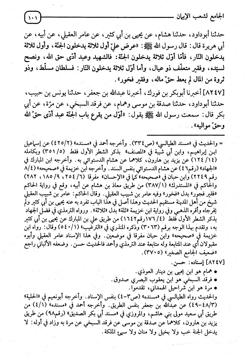8247 - أَخْبَرَنَا أَبُو بَكْرِ بْنُ فُورَكٍ، أنا عَبْدُ اللهِ بْنُ جَعْفَرٍ، نا يُونُسُ بْنُ حَبِيبٍ، نا أَبُو دَاوُدَ، نا صَدَقَةُ بْنُ مُوسَى، وَهَمَّامٌ، عَنْ فَرْقَدٍ السَّبَخِيِّ، عَنْ مُرَّةَ، عَنْ أَبِي بَكْرٍ، قَالَ: سَمِعْتُ رَسُولَ اللهِ صَلَّى اللَّهُ عَلَيْهِ وَسَلَّمَ يَقُولُ: §" أَوَّلُ مَنْ يَقْرَعُ بَابَ الْجَنَّةِ عَبْدٌ أَدَّى حَقَّ اللهِ وَحَقَّ مَوَالِيهِ "