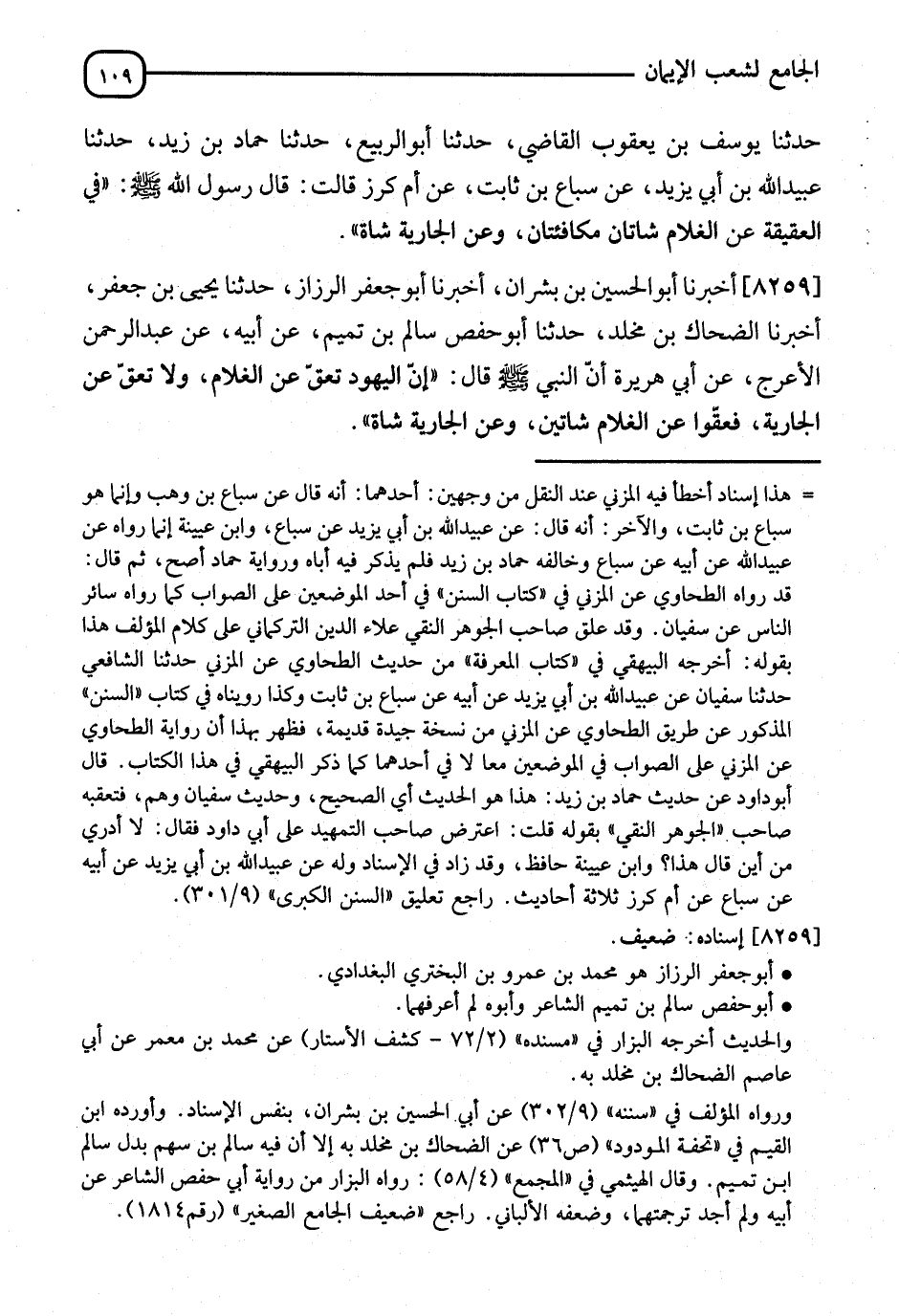8259 - وَأَخْبَرَنَا أَبُو الْحُسَيْنِ بْنُ بِشْرَانَ، أنا أَبُو جَعْفَرٍ الرَّزَّازُ، نا يَحْيَى بْنُ جَعْفَرٍ، أنا الضَّحَّاكُ بْنُ مَخْلَدٍ، أنا أَبُو حَفْصٍ سَالِمُ بْنُ تَمِيمٍ، عَنْ أَبِيهِ، عَنْ عَبْدِ الرَّحْمَنِ الْأَعْرَجِ، عَنْ أَبِي هُرَيْرَةَ، أَنَّ النَّبِيَّ صَلَّى اللَّهُ عَلَيْهِ وَسَلَّمَ قَالَ: " إِنَّ §الْيَهُودَ تَعُقُّ عَنِ الْغُلَامِ، وَلَا تَعُقَّ عَنِ الْجَارِيَةِ، فَعُقُّوا عَنِ الْغُلَامِ شَاتَيْنِ، وَعَنِ الْجَارِيَةِ شَاةً، -[110]- قَالَ: وَالرَّابِعَةُ أَنْ يَحْلِقَ عَقِيقَتَهُ وَهُوَ شَعَرُ رَأْسِهِ الَّذِي وُلِدَ بِهِ "