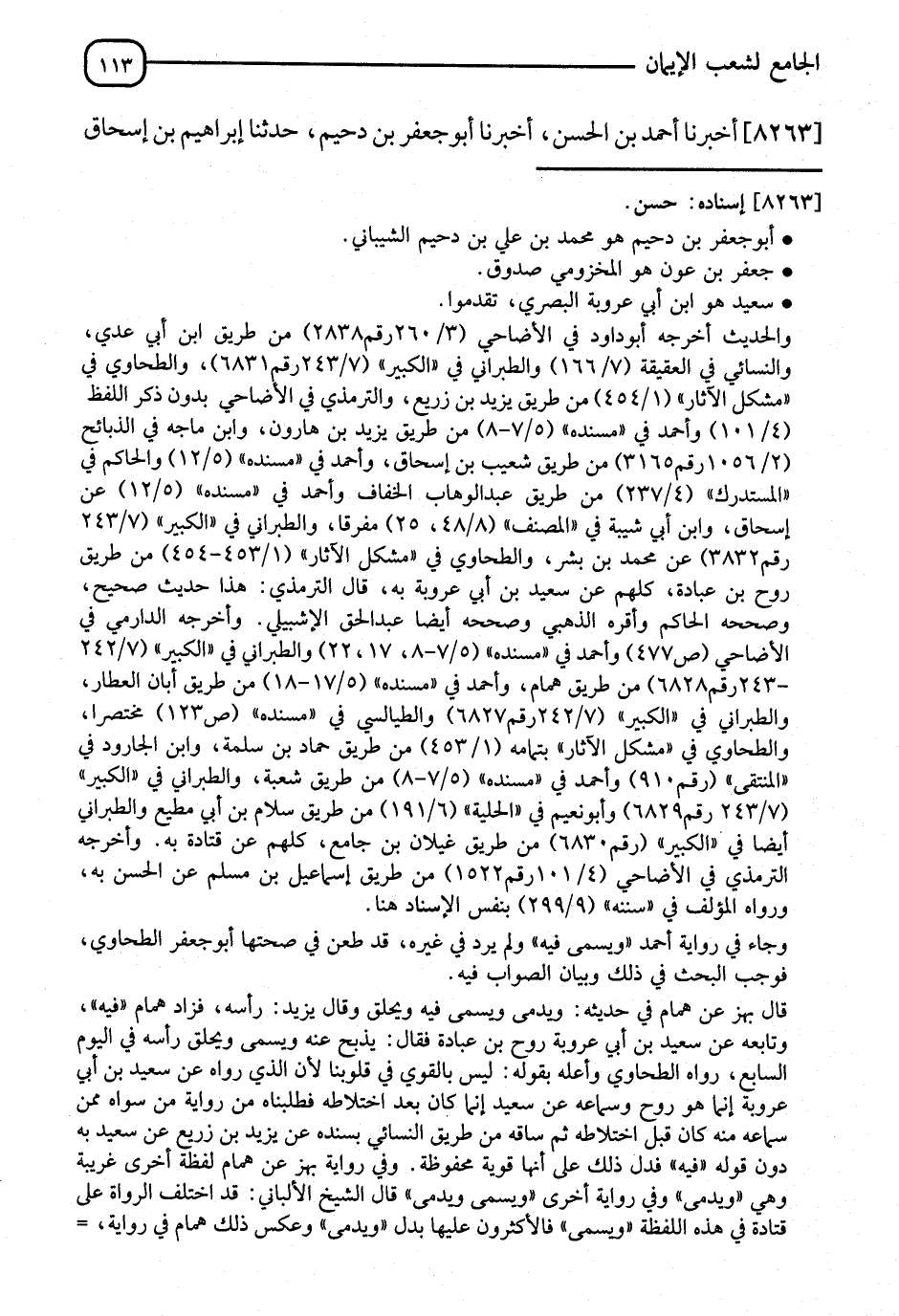 8263 - أَخْبَرَنَا أَحْمَدُ بْنُ الْحَسَنِ، أنا أَبُو جَعْفَرِ بْنُ دُحَيْمٍ، نا إِبْرَاهِيمُ بْنُ إِسْحَاقَ -[114]- الْقَاضِي، نا جَعْفَرُ بْنُ عَوْنٍ، عَنْ سَعِيدٍ، عَنْ قَتَادَةَ، عَنِ الْحَسَنِ، عَنْ سَمُرَةَ بْنِ جُنْدُبٍ، أَنَّ نَبِيَّ اللهِ صَلَّى اللَّهُ عَلَيْهِ وَسَلَّمَ قَالَ: " §كُلُّ غُلَامٍ رَهِينَةٌ بِعَقِيقَتِهِ، يُذْبَحُ عَنْهُ يَوْمَ سَابِعِهِ، وَيُحْلَقُ رَأْسُهُ، وَيُسَمَّى " قُلْتُ: وَلَوْ سَمَّاهُ يَوْمَ تُحَنُّكِهِ كَانَ أَوْلَى، وَيُشْبِهُ أَنْ يَكُونَ التَّارِيخُ فِي حَدِيثِ سَمُرَةَ لِلْعَقِيقَةِ وَالْحَلْقِ دُونَ التَّسْمِيَةِ "، فَقَدْ رُوِّينَا فِي حَدِيثِ أَبِي مُوسَى فِي تَسْمِيَةِ النَّبِيِّ صَلَّى اللَّهُ عَلَيْهِ وَسَلَّمَ وَلَدَهُ يَوْمَ حَنَّكَهُ بِتَمْرَةٍ