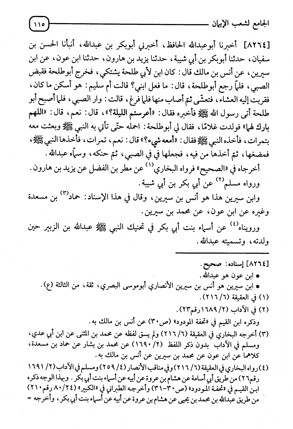 8264 - أَخْبَرَنَا أَبُو عَبْدِ اللهِ الْحَافِظُ، أَخْبَرَنِي أَبُو بَكْرِ بْنُ عَبْدِ اللهِ، أبنا الْحَسَنُ بْنُ سُفْيَانَ، أبنا أَبُو بَكْرِ بْنُ أَبِي شَيْبَةَ، أبنا يَزِيدُ بْنُ هَارُونَ، أبنا ابْنُ عَوْنٍ، عَنِ ابْنِ سِيرِينَ، عَنْ أَنَسِ بْنِ مَالِكٍ، قَالَ: كَانَ ابْنُ أَبِي طَلْحَةَ يَشْتَكِي، فَخَرَجَ أَبُو طَلْحَةَ فَقُبِضَ الصَّبِيُّ، فَلَمَّا رَجَعَ أَبُو طَلْحَةَ قَالَ: مَا فَعَلَ ابْنِي؟ قَالَتْ أُمُّ سُلَيْمٍ: هُوَ أَسْكَنُ مَا كَانَ، فَقَرَّبَتْ إِلَيْهِ الْعِشَاءَ، فَتَعَشَّى ثُمَّ أَصَابَ مِنْهَا، فَلَمَّا فَرَغَ مِنْهَا، قَالَتْ: وَارُوا الصَّبِيَّ، فَلَمَّا أَصْبَحَ أَبُو طَلْحَةَ أَتَى رَسُولَ اللهِ صَلَّى اللَّهُ عَلَيْهِ وَسَلَّمَ، فَأَخْبَرَهُ، فَقَالَ: " §أَعْرَسْتُمُ اللَّيْلَةَ "؟ قَالَ: نَعَمْ، قَالَ: " اللهُمَّ بَارِكْ لَهُمَا "، فَوَلَدَتْ غُلَامًا، فَقَالَ لِي أَبُو طَلْحَةَ: احْمِلْهُ حَتَّى نَأْتِيَ بِهِ النَّبِيَّ صَلَّى اللَّهُ عَلَيْهِ وَسَلَّمَ، وَبَعَثَتْ مَعَهُ تَمَرَاتٍ، فَأَخَذَهُ النَّبِيُّ صَلَّى اللَّهُ عَلَيْهِ وَسَلَّمَ فَقَالَ: " أَمَعَهُ شَيْءٌ "؟ قَالُوا: نَعَمْ، تَمَرَاتٌ، فَأَخَذَهُ النَّبِيُّ صَلَّى اللَّهُ عَلَيْهِ وَسَلَّمَ فَمَضَغَهَا، ثُمَّ أَخَذَهَا مِنْ فِيهِ فَجَعَلَهَا فِي فِي الصَّبِيِّ، ثُمَّ حَنَّكَهُ وَسَمَّاهُ عَبْدَ اللهِ " أَخْرَجَاهُ فِي الصَّحِيحِ، فَرَوَاهُ الْبُخَارِيُّ، عَنْ مَطَرِ بْنِ الْفَضْلِ، عَنْ يَزِيدَ بْنِ هَارُونَ، وَرَوَاهُ مُسْلِمٌ، عَنْ أَبِي بَكْرِ بْنِ أَبِي شَيْبَةَ، وَابْنُ سِيرِينَ، هَذَا هُوَ أَنَسُ بْنُ سِيرِينَ، وَقَالَ فِي الْإِسْنَادِ: حَمَّادُ بْنُ مَسْعَدَةَ وَغَيْرُهُ، عَنِ ابْنِ عَوْنٍ، عَنْ مُحَمَّدِ بْنِ سِيرِينَ وَرُوِّينَاهُ عَنْ أَسْمَاءَ بِنْتِ أَبِي بَكْرٍ، فِي تَحْنِيكِ النَّبِيِّ صَلَّى اللَّهُ عَلَيْهِ وَسَلَّمَ عَبْدَ اللهِ بْنَ الزُّبَيْرِ حِينَ وَلَدَتْهُ، وَتَسْمِيَتُهُ عَبْدَ اللهِ، -[116]- وَفِي كُلِّ ذَلِكَ دَلَالَةٌ عَلَى أَنَّ التَّارِيخَ فِي حَدِيثِ سَمُرَةَ يُشْبِهُ أَنْ يَكُونَ رَاجِعًا إِلَى التَّسْمِيَةِ، وَاللهُ أَعْلَمُ. وَفِي الْعَقِيقَةِ سُنَنٌ وَآثَارٌ، وَكَذَلِكَ فِي تَسْمِيَةِ الْمَوْلُودِ وَتَكْنِيَتِهِ، وَقَدْ ذَكَرْنَاهَا فِي كِتَابِ الْعَقِيقَةِ مِنْ كِتَابِ السُّنَنِ، وَفِي إِعَادَتِهَا ههُنَا مَشَقَّةٌ، فَتَرَكْتُهَا اخْتِصَارًا، مَنْ أَرَادَهَا رَجَعَ إِلَيْهَا إِنْ شَاءَ اللهُ