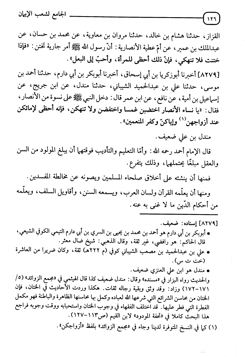 8279 - أَخْبَرَنَا أَبُو زَكَرِيَّا بْنُ أَبِي إِسْحَاقَ، أنا أَبُو بَكْرِ بْنُ أَبِي دَارِمٍ، نا أَحْمَدُ بْنُ مُوسَى، نا عَلِيُّ بْنُ عَبْدِ الْحَمِيدِ الشَّيْبَانِيُّ، ثنا مَندَلٌ، عَنِ ابْنِ جُرَيْجٍ، عَنْ إِسْمَاعِيلَ بْنِ أُمَيَّةَ، عَنْ نَافِعٍ، عَنِ ابْنِ عُمَرَ، قَالَ: دَخَلَ النَّبِيُّ صَلَّى اللَّهُ عَلَيْهِ وَسَلَّمَ عَلَى نِسْوَةٍ مَنَ الْأَنْصَارِ، فَقَالَ: " يَا نِسَاءَ الْأَنْصَارِ، §اخْتَضِبْنَ عَمْسًا، وَاخْتَفِضْنَ وَلَا تَنْهَكْنَ، فَإِنَّهُ أَحْظَى لِإِنَاثِكُنَّ عِنْدَ أَزْوَاجِهِنَّ، وَإِيَّاكُنَّ وَكُفْرَ الْمُنَعَّمِينَ " مَندَلُ بْنُ عَلِيٍّ ضَعِيفٌ، قَالَ الْإِمَامُ أَحْمَدُ رَحِمَهُ اللهُ: وَأَمَّا التَّعْلِيمُ وَالتَّأْدِيبُ فَوَقْتُهُنَّ أَنْ يَبْلُغَ الْمَوْلُودُ مِنَ السِّنِّ وَالْعَقْلِ مَبْلَغًا يَحْتَمِلُهَا، وَذَلِكَ يَتَفَرَّعُ، فَمِنْهَا أَنْ يُنَشِّئَهُ عَلَى أَخْلَاقِ صُلَحَاءِ الْمُسْلِمِينَ، وَيَصُونَهُ عَنْ مُخَالَطَةِ الْمُفْسِدِينَ، وَمِنْهَا: أَنْ يُعَلِّمَهُ الْقُرْآنَ وَلِسَانَ الْأَدَبِ وَيُسْمِعَهُ السُّنَنَ، وَأَقَاوِيلَ السَّلَفِ، وَيُعَلِّمَهُ مِنْ أَحْكَامِ الدِّينِ مَا لَا غِنَى بِهِ عَنْهُ، -[127]- وَمِنْهَا: أَنْ يُرْشِدَهُ مِنَ الْمَكَاسِبِ إِلَى مَا يُحْمَدُ وَيُرْجَى أَنْ يَرُدَّ عَلَيْهِ كِفَايَتَهُ، فَإِذَا بَلَغَ أَحَدُهُمْ حَدَّ الْعَقْلِ عُرِّفَ الْبَارِئَ جَلَّ جَلَالُهُ إِلَيْهِ بِالدَّلَائِلِ الَّتِي تُوصِلُهُ إِلَى مَعْرِفَتِهِ مِنْ غَيْرِ أَنْ يُسْمِعَهُ مِنْ مَقَالَاتِ الْمُلْحِدِينَ شَيْئًا، وَيَذْكُرُهُمْ لَهُ فِي الْجُمْلَةِ أَحْيَانًا، وَيُحَذِّرُهُ إِيَّاهُمْ، وَيُنَفِّرُهُ عَنْهُمْ، وَيُبَغِّضُهُمْ إِلَيْهِ مَا اسْتَطَاعَ، وَيَبْدَأُ مِنَ الدَّلَائِلِ بِالْأَقْرَبِ الْأَجْلَى، ثُمَّ مَا يَلِيهِ، وَكَذَلِكَ يَفْعَلُ بِالدَّلَائِلِ الدَّالَّةِ عَلَى نُبُوَّةِ نَبِيِّنَا صَلَّى اللَّهُ عَلَيْهِ وَسَلَّمَ بِهَدْيِهِ فِيهَا إِلَى الْأَقْرَبِ الْأَوْضَحِ، ثُمَّ الَّذِي يَلِيهِ وَبَسَطَ الْحَلِيمِيُّ الْكَلَامَ فِي كُلِّ فَصْلٍ مِنْ فُصُولِ هَذَا الْبَابِ، مَنْ أَرَادَ الْوُقُوفَ عَلَيْهِ رَجَعَ إِلَيْهِ إِنْ شَاءَ اللهُ تَعَالَى