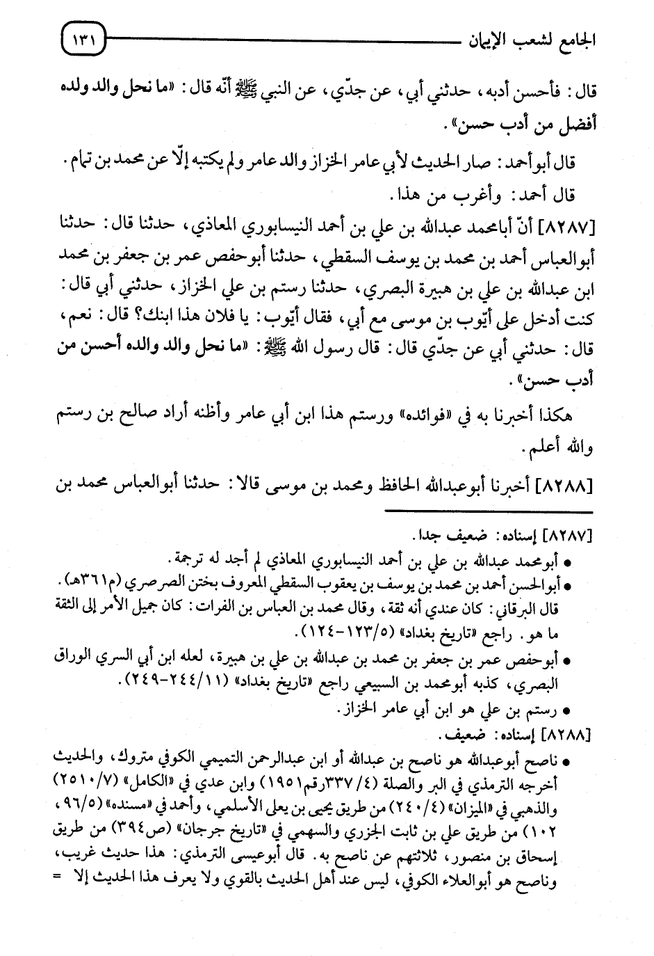 8287 - أَنَّ أَبَا مُحَمَّدٍ عَبْدَ اللهِ بْنَ عَلِيِّ بْنِ أَحْمَدَ النَّيْسَابُورِيَّ الْمُعَاذِيَّ، أَخْبَرَنَا أَبُو الْعَبَّاسِ أَحْمَدُ بْنُ مُحَمَّدِ بْنِ يُوسُفَ السَّقَطِيُّ، نا أَبُو حَفْصٍ عُمَرُ بْنُ جَعْفَرِ بْنِ مُحَمَّدِ بْنِ عَبْدِ اللهِ بْنِ عَلِيِّ بْنِ هُبَيْرَةَ الْبَصْرِيُّ، نا رُسْتُمُ بْنُ عَلِيٍّ الْخَزَّارُ، حَدَّثَنِي أَبِي، قَالَ: كُنْتُ أَدْخُلُ عَلَى أَيُّوبَ بْنِ مُوسَى مَعَ أَبِي، فَقَالَ أَيُّوبُ: يَا أَبَا فُلَانٍ، هَذَا ابْنُكَ؟ قَالَ: نَعَمْ، قَالَ: حَدَّثَنِي أَبِي، عَنْ جَدِّي، قَالَ: قَالَ رَسُولُ اللهِ صَلَّى اللَّهُ عَلَيْهِ وَسَلَّمَ: §" مَا نَحِلَ وَالِدٌ وَلَدًا أَحْسَنَ مِنْ أَدَبٍ حَسَنٍ " هَكَذَا أَخْبَرَنَا بِهِ فِي فَوَائِدِهِ، وَرُسْتُمُ هُوَ ابْنُ عَامِرٍ، وَأَظُنُّهُ أَرَادَ صَالِحَ بْنَ رُسْتُمَ، وَاللهُ أَعْلَمُ