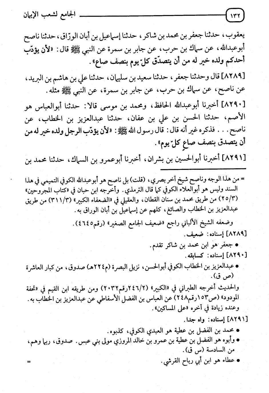 8290 - أَخْبَرَنَا أَبُو عَبْدِ اللهِ الْحَافِظُ، وَمُحَمَّدُ بْنُ مُوسَى، قَالَا: نا أَبُو الْعَبَّاسِ هُوَ الْأَصَمُّ، نا الْحَسَنُ بْنُ عَلِيِّ بْنِ عَفَّانَ، نا عَبْدُ الْعَزِيزِ بْنُ الْخَطَّابِ، عَنْ نَاصِحٍ، فَذَكَرَهُ، غَيْرَ أَنَّهُ قَالَ: قَالَ رَسُولُ اللهِ صَلَّى اللَّهُ عَلَيْهِ وَسَلَّمَ: §" لَأَنْ يُؤَدِّبَ الرَّجُلُ وَلَدَهُ خَيْرٌ لَهُ مِنْ أَنْ يَتَصَدَّقَ بِنِصْفِ صَاعٍ كُلَّ يَوْمٍ "
