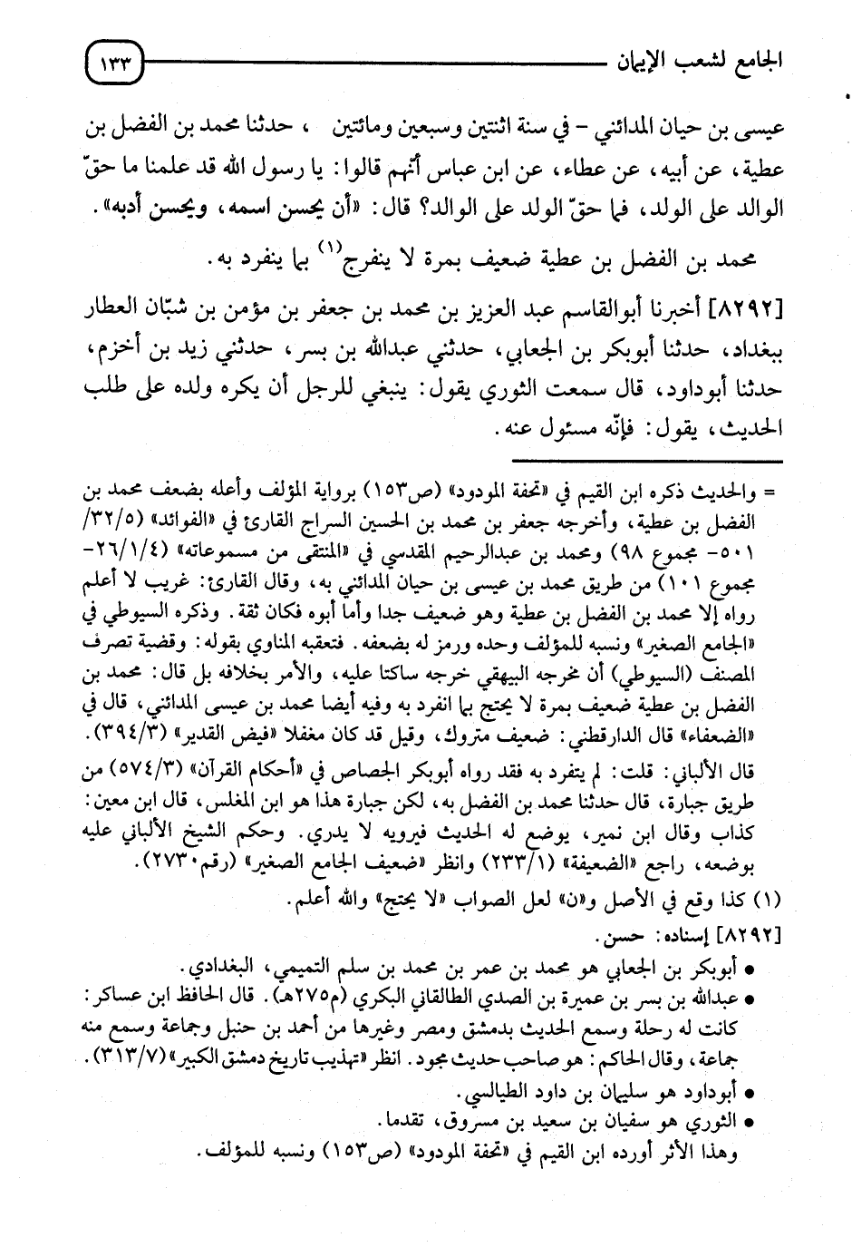 8292 - أَخْبَرَنَا أَبُو الْقَاسِمِ عَبْدُ الْعَزِيزِ بْنُ مُحَمَّدِ بْنِ جَعْفَرِ بْنِ مُؤْمَنِ بْنِ شُبَّانَ الْعَطَّارُ، بِبَغْدَادَ، نا أَبُو بَكْرِ بْنُ الْجِعَابِيُّ، حَدَّثَنِي عَبْدُ اللهِ بْنُ بِشْرٍ، نا زَيْدُ بْنُ أَخْرَمَ، نا أَبُو دَاوُدَ، قَالَ: سَمِعْتُ الثَّوْرِيَّ، يَقُولُ: " §يَنْبَغِي لِلرَّجُلِ أَنْ يُكْرِهَ وَلَدَهُ عَلَى طَلَبِ الْحَدِيثِ، يَقُولُ: فَإِنَّهُ مَسْئُولٌ عَنْهُ "
