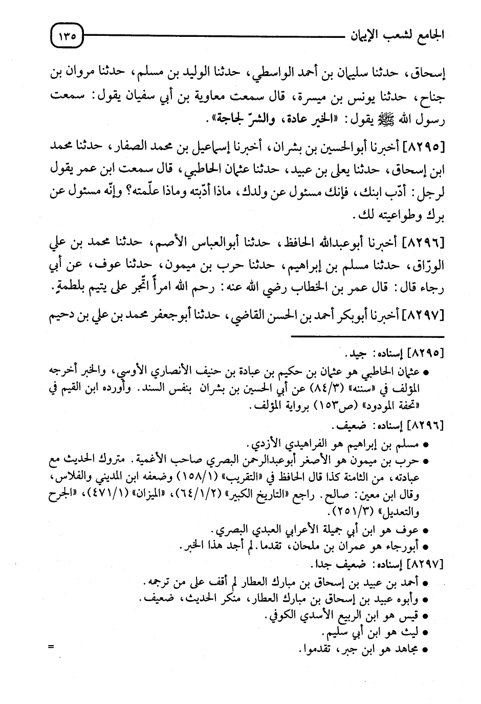 8295 - أَخْبَرَنَا أَبُو الْحُسَيْنِ بْنُ بِشْرَانَ، أنا أَبُو عَمْرِو بْنُ السَّمَّاكِ، أنا إِسْمَاعِيلُ بْنُ مُحَمَّدٍ الصَّفَّارُ، نا مُحَمَّدُ بْنُ إِسْحَاقَ، نا يَعْلَى بْنُ عُبَيْدٍ، نا عُثْمَانُ الْحَاطِبِيُّ، قَالَ: سَمِعْتُ ابْنَ عُمَرَ يَقُولُ لِرَجُلٍ: " §أَدِّبِ ابْنِكَ، فَإِنَّكَ مَسْئُولٌ عَنْ وَلَدِكَ، مَاذَا أَدَّبْتَهُ؟ وَمَاذَا عَلَّمْتَهُ، وَإِنَّهُ مَسْئُولٌ عَنْ بِرِّكَ وَطَوَاعِيَتِهِ لَكَ "