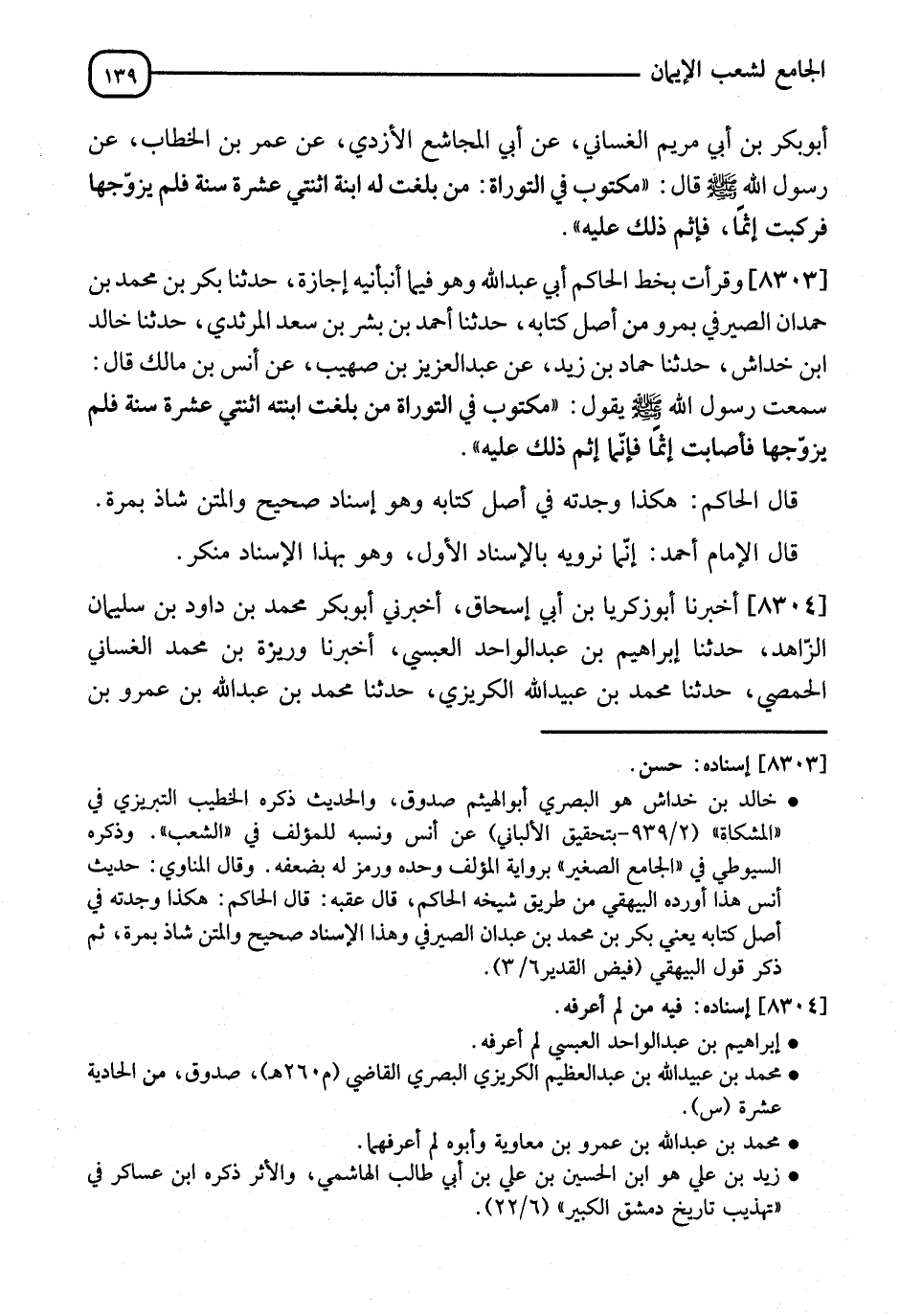 8303 - وَقَرَأْتُ بِخَطِّ الْحَاكِمِ أَبِي عَبْدِ اللهِ، وَهُوَ فِيمَا أَنْبَأَنِيهِ إِجَازَةً، نا بَكْرُ بْنُ مُحَمَّدِ بْنِ عَبْدَانَ الصَّيْرَفِيُّ، بِمَرْوَ مِنْ أَصْلِ كِتَابِهِ، نا أَحْمَدُ بْنُ بِشْرِ بْنِ سَعْدٍ الْمَرْثَدِيُّ، نا خَالِدُ بْنُ خِدَاشٍ، نا حَمَّادُ بْنُ زَيْدٍ، عَنْ عَبْدِ الْعَزِيزِ بْنِ صُهَيْبٍ، عَنْ أَنَسِ بْنِ مَالِكٍ، قَالَ: سَمِعْتُ رَسُولَ اللهِ صَلَّى اللَّهُ عَلَيْهِ وَسَلَّمَ يَقُولُ: " فِي التَّوْرَاةِ مَكْتُوبٌ: §مَنْ بَلَغَتِ ابْنَتُهُ اثْنَتَيْ عَشْرَةَ سَنَةً فَلَمْ يُزَوِّجْهَا فَأَصَابَتْ إِثْمًا فَإِثْمُ ذَلِكَ عَلَيْهِ " قَالَ الْحَاكِمُ: هَذَا وَجَدْتُهُ فِي أَصْلِ كِتَابِهِ، وَهَذَا إِسْنَادٌ صَحِيحٌ وَالْمَتْنُ شَاذُّ بِمَرَّةٍ. قَالَ الْإِمَامُ أَحْمَدُ: إِنَّمَا يَرْوِيهِ بِالْإِسْنَادِ الْأَوَّلِ، وَهُوَ بِهَذَا الْإِسْنَادِ مُنْكَرٌ