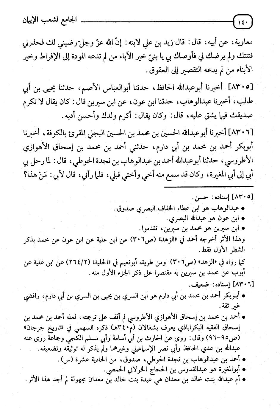 8306 - أَخْبَرَنَا أَبُو عَبْدِ اللهِ الْحُسَيْنُ بْنُ مُحَمَّدِ بْنِ الْحَسَنِ الْبَجَلِيُّ الْمُقْرِئُ، بِالْكُوفَةِ، أنا أَبُو بَكْرٍ أَحْمَدُ بْنُ مُحَمَّدِ بْنِ أَبِي دَارِمٍ، حَدَّثَنِي أَحْمَدُ بْنُ مُحَمَّدِ بْنِ إِسْحَاقَ الْأَهْوَازِيُّ الْأُطْرُوشِيُّ، نا أَبُو عَبْدِ اللهِ أَحْمَدُ بْنُ عَبْدِ الْوَهَّابِ بْنِ نَجْدَةَ الْحَوْطِيُّ، قَالَ: لَمَّا رَحْلَ بِي أَبِي إِلَى أَبِي الْمُغِيرَةِ، وَكَانَ قَدْ سَمِعَ مِنْهُ أَخِي وَأُخْتِي قَبْلِي، فَلَمَّا رَآنِي قَالَ لِأَبِي: مَنْ هَذَا؟ -[141]- قَالَ: ابْنِي، قَالَ: وَمَا تُرِيدُ بِهِ؟ قَالَ: يَسْمَعُ مِنْكَ، قَالَ: وَيَفْهَمُ؟ فَقَالَ لِي أَبِي وَكُنَّا فِي مَسْجِدٍ: قُمْ فَصَلِّ رَكْعَتَيْنِ، وَارْفَعْ صَوْتَكَ بِالتَّكْبِيرِ وَالِاسْتِفْتَاحِ بِالْقِرَاءَةِ وَالتَّسْبِيحِ فِي الرُّكُوعِ وَالسُّجُودِ وَالتَّشَهُّدِ، فَفَعَلْتُ، فَقَالَ لِي أَبُو الْمُغِيرَةِ: أَحْسَنْتَ، فَقَالَ أَبِي: حَدِّثْهُ، فَقُلْتُ: حَدَّثَنِي أَخِي وَأُخْتِي، عَنْ أَبِي الْمُغِيرَةِ، عَنْ أُمِّ عَبْدِ اللهِ بِنْتِ خَالِدِ بْنِ سَعْدَانَ، عَنْ أَبِيهِا، قَالَ: " §مِنْ حَقِّ الْوَلَدِ عَلَى وَالِدِهِ أَنْ يُحْسِنَ أَدَبَهُ وَتَعْلِيمَهُ، فَإِذَا بَلَغَ اثْنَتَيْ عَشْرَةَ سَنَةً فَلَا حَقَّ لَهُ عَلَيْهِ، وَقَدْ وَجَبَ حَقُّ الْوَالِدِ عَلَى وَلَدِهِ فَإِنْ هُوَ أَرْضَاهُ فَلْيَتَّخِذْهُ شَرِيكًا، وَإِنْ لَمْ يَتَّبِعْ رِضَاهُ فَلْيَتَّخِذْهُ عَدُوًّا "، فَقَالَ أَبُو الْمُغِيرَةِ: " قَدْ أَغْنَاكَ اللهُ عَنْ أَبِيكَ، وَعَنْ أُخْتِكَ، وَعَنْ أَخِيكَ، قُلْ: حَدَّثَنِي أَبُو الْمُغِيرَةِ، اجْلِسْ بَارَكَ اللهُ عَلَيْكَ، فَحَدَّثَنِي بِهِ، يَعْنِي: هَذَا الْحَدِيثَ