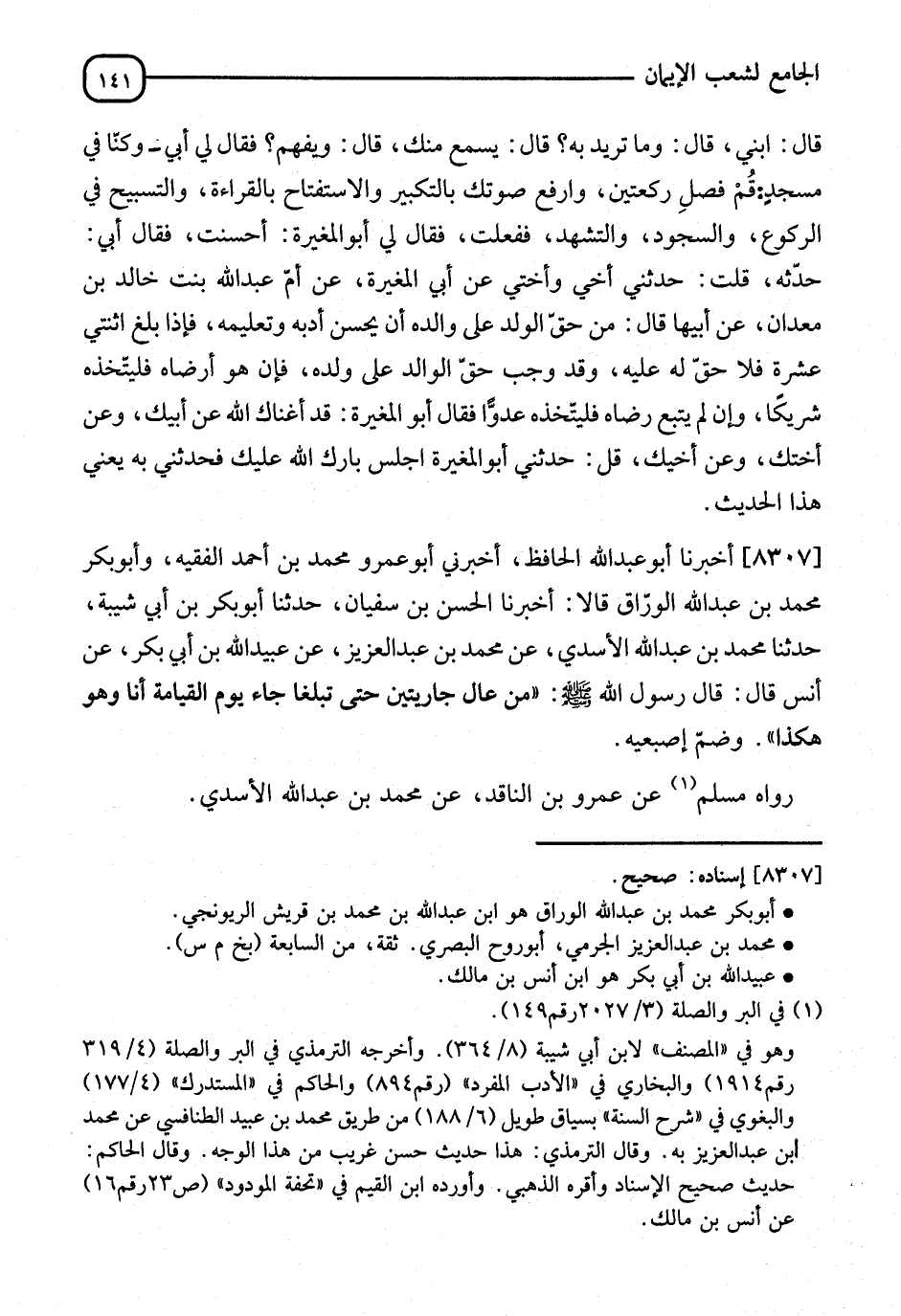 8307 - أَخْبَرَنَا أَبُو عَبْدِ اللهِ الْحَافِظُ، أَخْبَرَنِي أَبُو عَمْرٍو مُحَمَّدُ بْنُ أَحْمَدَ الْفَقِيهُ، وَأَبُو بَكْرٍ مُحَمَّدُ بْنُ عَبْدِ اللهِ الْوَرَّاقُ، قَالَا: أنا الْحَسَنُ بْنُ سُفْيَانَ، نا أَبُو بَكْرِ بْنُ أَبِي شَيْبَةَ، نا مُحَمَّدُ بْنُ عَبْدِ اللهِ الْأَسَدِيُّ، عَنْ مُحَمَّدِ بْنِ عَبْدِ الْعَزِيزِ، عَنْ عُبَيْدِ اللهِ بْنِ أَبِي بَكْرٍ، عَنْ أَنَسٍ، قَالَ: قَالَ رَسُولُ اللهِ صَلَّى اللَّهُ عَلَيْهِ وَسَلَّمَ: §" مَنْ عَالَ جَارِيَتَيْنِ حَتَّى يَبْلُغَا جَاءَ يَوْمَ الْقِيَامَةِ أَنَا وَهُوَ هَكَذَا، وَضَمَّ أُصْبُعَيْهِ " رَوَاهُ مُسْلِمٌ، عَنْ عَمْرٍو النَّاقِدِ، عَنْ مُحَمَّدِ بْنِ عَبْدِ اللهِ الْأَسَدِيِّ