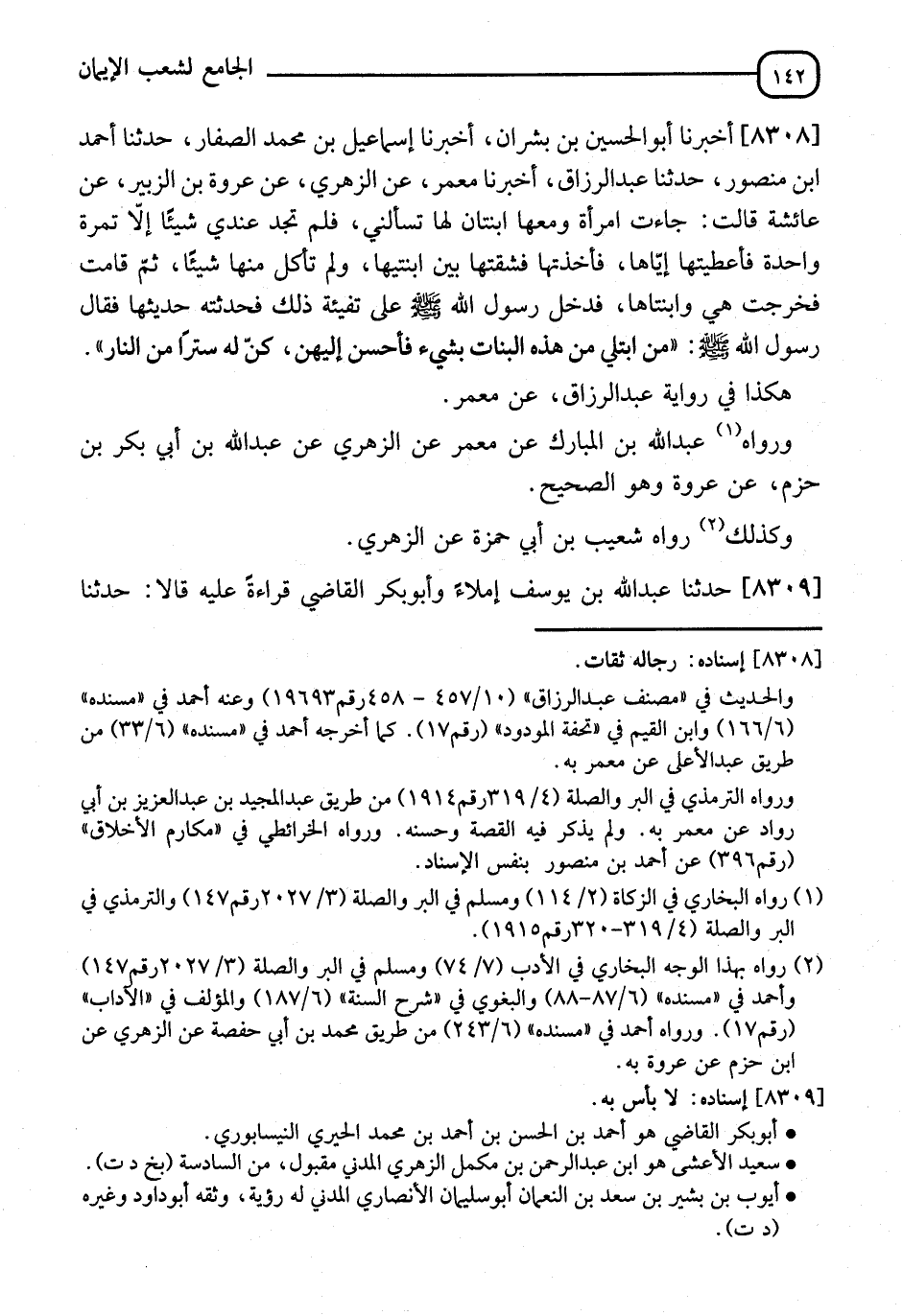 8308 - أَخْبَرَنَا أَبُو الْحُسَيْنِ بْنُ بِشْرَانَ، أنا إِسْمَاعِيلُ بْنُ مُحَمَّدٍ الصَّفَّارُ، نا أَحْمَدُ بْنُ مَنْصُورٍ، نا عَبْدُ الرَّزَّاقِ، أنا مَعْمَرٌ، عَنِ الزُّهْرِيِّ، عَنْ عُرْوَةَ بْنِ الزُّبَيْرِ، عَنْ عَائِشَةَ، قَالَتْ: جَاءَتِ امْرَأَةٌ وَمَعَهَا ابْنَتَانِ لَهَا تَسْأَلُنِي، فَلَمْ تَجِدْ عِنْدِي شَيْئًا غَيْرَ تَمْرَةٍ وَاحِدَةٍ، فَأَعْطَيْتُهَا إِيَّاهَا، فَأَخَذَتْهَا فَشَقَّقَتْهَا بَيْنَ ابْنَتَيْهَا وَلَمْ تَأْكُلْ مِنْهَا شَيْئًا، ثُمَّ قَامَتْ فَخَرَجَتْ هِيَ وَابْنَتَاهَا، فَدَخَلَ رَسُولُ اللهِ صَلَّى اللَّهُ عَلَيْهِ وَسَلَّمَ عَلَى بَقِيَّةِ ذَلِكَ فَحَدَّثْتُهُ حَدِيثَهَا، فَقَالَ رَسُولُ اللهِ صَلَّى اللَّهُ عَلَيْهِ وَسَلَّمَ: §" مَنِ ابْتُلِيَ مِنْ هَذِهِ الْبَنَاتِ بِشَيْءٍ فَأَحْسَنَ إِلَيْهِنَّ كُنَّ لَهُ سِتْرًا مِنَ النَّارِ " هَكَذَا فِي رِوَايَةِ عَبْدِ الرَّزَّاقِ، عَنْ مَعْمَرٍ، وَرَوَاهُ عَبْدُ اللهِ بْنُ الْمُبَارَكِ، عَنْ مَعْمَرٍ، عَنِ الزُّهْرِيِّ، عَنْ عَبْدِ اللهِ بْنِ أَبِي بَكْرِ بْنِ حَزْمٍ، عَنْ عُرْوَةَ وَهُوَ الصَّحِيحُ، وَكَذَلِكَ رَوَاهُ شُعَيْبُ بْنُ أَبِي حَمْزَةَ، عَنِ الزُّهْرِيِّ