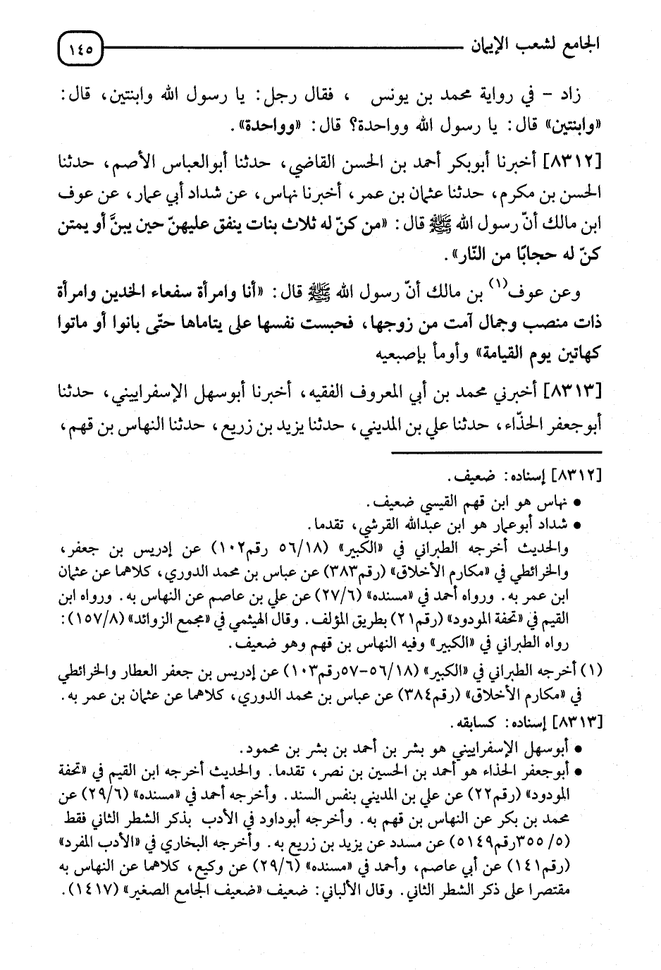 8313 - أَخْبَرَنَا مُحَمَّدُ بْنُ أَبِي الْمَعْرُوفِ الْفَقِيهُ، أنا أَبُو سَهْلٍ الْإِسْفَرَاينِيُّ، نا أَبُو جَعْفَرٍ الْحَذَّاءُ، نا عَلِيُّ بْنُ الْمَدِينِيِّ، نا زَيْدُ بْنُ زُرَيْعٍ، نا النَّهَّاسُ بْنُ قَهْمٍ، -[146]- نا شَدَّادٌ أَبُو عَمَّارٍ، عَنْ عَوْفِ بْنِ مَالِكٍ الْأَشْجَعِيِّ، قَالَ: قَالَ رَسُولُ اللهِ صَلَّى اللَّهُ عَلَيْهِ وَسَلَّمَ: §" مَا مِنْ عَبْدٍ يَكُونُ لَهُ ثَلَاثُ بَنَاتٍ فَيُنْفِقُ عَلَيْهِنَّ حَتَّى يَبِنَّ أَوْ يَمُتْنَ إِلَّا كُنَّ لَهُ حِجَابًا مِنَ النَّارِ " فَقَالَتِ امْرَأَةٌ: يَا رَسُولَ اللهِ، وَاثْنَتَانِ؟ قَالَ: " وَاثْنَتَانِ "