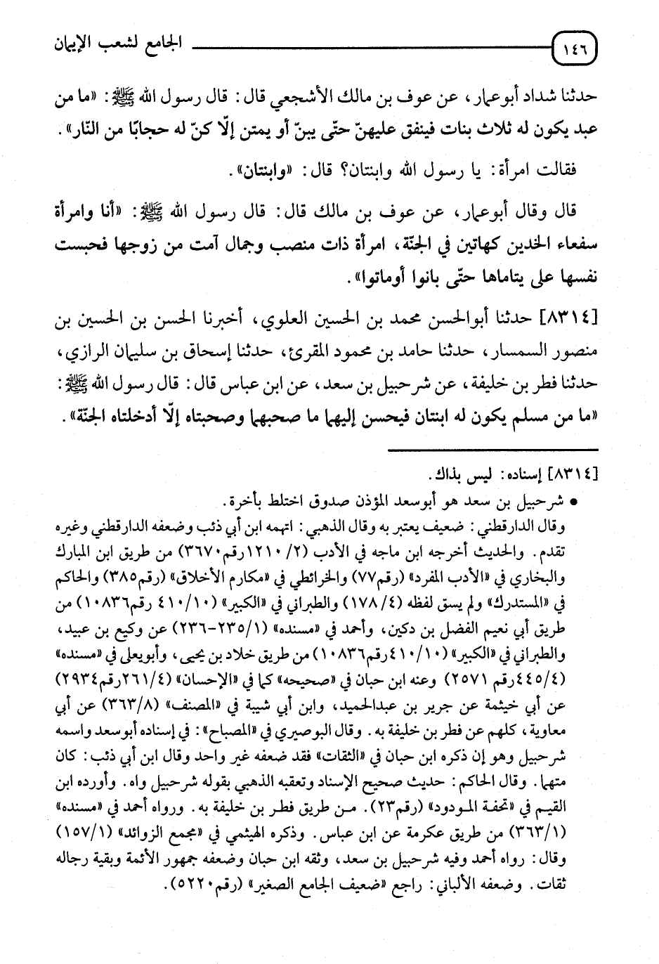 8314 - حَدَّثَنَا أَبُو الْحَسَنِ مُحَمَّدُ بْنُ الْحُسَيْنِ الْعَلَوِيُّ، أنا الْحَسَنُ بْنُ الْحُسَيْنِ بْنِ مَنْصُورٍ السِّمْسَارُ، نا حَامِدُ بْنُ مَحْمُودٍ الْمُقْرِئُ، نا إِسْحَاقُ بْنُ سُلَيْمَانَ الرَّازِيُّ، نا فِطْرُ بْنُ خَلِيفَةَ، عَنْ شُرَحْبِيلَ بْنِ سَعْدٍ، عَنِ ابْنِ عَبَّاسٍ، قَالَ: قَالَ رَسُولُ اللهِ صَلَّى اللَّهُ عَلَيْهِ وَسَلَّمَ: §" مَا مِنْ مُسْلِمٍ يَكُونُ لَهُ ابْنَتَانِ فَيُحْسِنُ إِلَيْهِمَا مَا صَحِبَهُمَا وَصَحِبَتَاهُ إِلَّا أَدْخَلَتَاهُ الْجَنَّةَ "