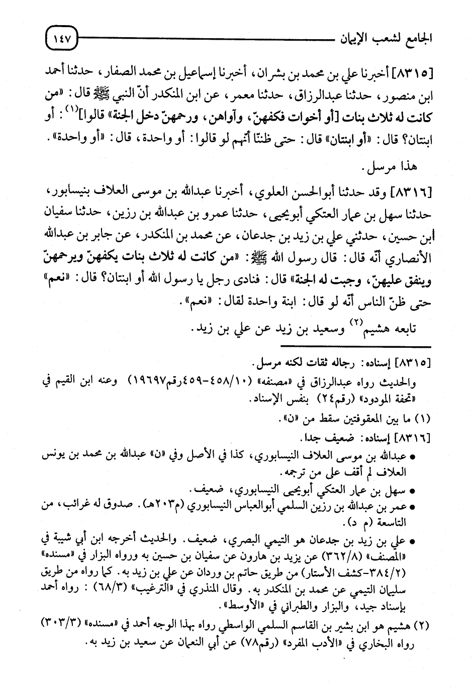 8315 - أَخْبَرَنَا عَلِيُّ بْنُ مُحَمَّدِ بْنِ بِشْرَانَ، أنا إِسْمَاعِيلُ بْنُ مُحَمَّدٍ الصَّفَّارُ، نا أَحْمَدُ بْنُ مَنْصُورٍ، نا عَبْدُ الرَّزَّاقِ، نا مَعْمَرٌ، عَنِ ابْنِ الْمُنْكَدِرِ، أَنَّ النَّبِيَّ صَلَّى اللَّهُ عَلَيْهِ وَسَلَّمَ قَالَ: §" مَنْ كَانَتْ لَهُ ثَلَاثُ بَنَاتٍ أَوْ أَخَوَاتٍ فَكَفَّهُنَّ وَأَوَاهُنَّ وَرَحِمَهُنَّ دَخَلَ الْجَنَّةَ "، قَالُوا: أَوِ اثْنَتَانِ؟ قَالَ: " أَوِ اثْنَتَانِ "، قَالَ: حَتَّى ظَنَنَّا أَنَّهُمْ لَوْ قَالُوا: أَوْ وَاحِدَةً قَالَ: أَوْ وَاحِدَةً. هَذَا مُرْسَلٌ وَقَدْ