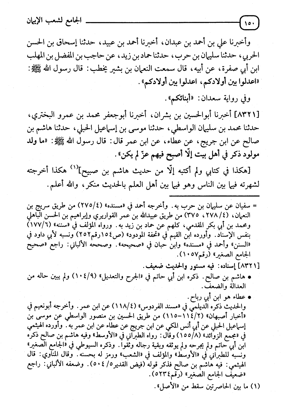 8321 - أَخْبَرَنَا أَبُو الْحُسَيْنِ بْنُ بِشْرَانَ، أنا أَبُو جَعْفَرٍ مُحَمَّدُ بْنُ عَمْرٍو الْبَخْتَرِيُّ، نا مُحَمَّدُ بْنُ سُلَيْمَانَ الْوَاسِطِيُّ، نا مُوسَى بْنُ إِسْمَاعِيلَ الْحُبُلِيُّ، نا هَاشِمُ بْنُ صُبَيْحٍ، عَنِ ابْنِ جُرَيْجٍ، عَنْ عَطَاءٍ، عَنِ ابْنِ عُمَرَ، قَالَ: قَالَ رَسُولُ اللهِ صَلَّى اللَّهُ عَلَيْهِ وَسَلَّمَ: §" مَا وُلِدَ مَوْلُودٌ ذَكَرٌ فِي أَهْلِ بَيْتٍ إِلَّا أَصْبَحَ فِيهِمْ عِزٌّ " لَمْ يَكُنْ هَكَذَا فِي كِتَابِي، وَلَمْ أَكْتُبْهُ - عِلْمِي - إِلَّا مِنْ حَدِيثِ هَاشِمِ بْنِ صُبَيْحٍ. هَكَذَا أَخْرَجْتُهُ لِشُهْرَتِهِ فِيمَا بَيْنَ النَّاسِ، وَهُوَ فِيمَا بَيْنَ أَهْلِ الْعِلْمِ بِالْحَدِيثِ مُنْكَرٌ، وَاللهُ أَعْلَمُ، -[151]- هَكَذَا فِي كِتَابِي، وَقَدْ