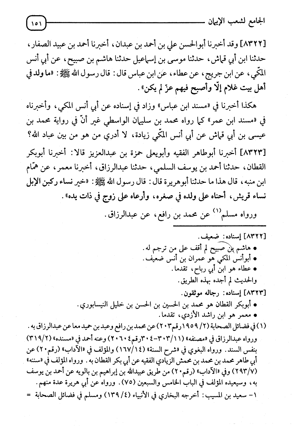 8322 - أَخْبَرَنَا أَبُو الْحَسَنِ عَلِيُّ بْنُ أَحْمَدَ بْنِ عَبْدَانَ، أنا أَحْمَدُ بْنُ عُبَيْدٍ الصَّفَّارُ، نا ابْنُ أَبِي قَمَّاشٍ، نا مُوسَى بْنُ إِسْمَاعِيلَ، نا هَاشِمُ بْنُ صُبَيْحٍ، عَنْ أَبِي أَنَسٍ الْمَكِّيِّ، عَنِ ابْنِ جُرَيْجٍ، عَنْ عَطَاءٍ، عَنِ ابْنِ عَبَّاسٍ، قَالَ: قَالَ رَسُولُ اللهِ صَلَّى اللَّهُ عَلَيْهِ وَسَلَّمَ: §" مَا وُلِدَ فِي أَهْلِ بَيْتٍ غُلَامٌ إِلَّا وَأَصْبَحَ فِيهِمْ عِزٌّ لَمْ يَكُنْ " هَكَذَا أَخْبَرَنَا فِي مُسْنَدِ ابْنِ عَبَّاسٍ، وَزَادَ فِي إِسْنَادِهِ، عَنْ أَبِي أَنَسٍ الْمَكِّيِّ، وَأَخْبَرْنَاهُ فِي مُسْنَدِ ابْنِ عُمَرَ، وَقَالَ ابْنُ عُمَرَ، غَيْرَ أَنَّهُ قَالَ فِي إِسْنَادِهِ: نا أَبُو عِمْرَانَ الْحُبُلِيُّ وَهُوَ مُوسَى بْنُ إِسْمَاعِيلَ، فَالْحَدِيثُ عَنِ ابْنِ عُمَرَ، كَمَا رَوَاهُ مُحَمَّدُ بْنُ سُلَيْمَانَ الْوَاسِطِيُّ، غَيْرَ أَنَّهُ فِي رِوَايَةِ مُحَمَّدِ بْنِ عِيسَى بْنِ أَبِي قَمَّاشٍ، عَنْ أَبِي أَنَسٍ الْمَكِّيِّ زِيَادَةٌ لَا أَدْرِي مَنْ هُوَ مِنْ بَيْنِ عِبَادِ اللهِ