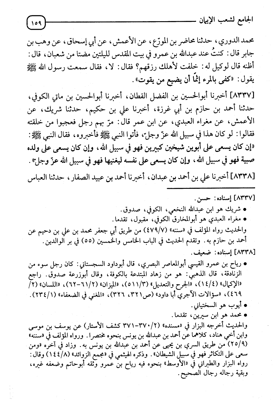 8337 - أَخْبَرَنَا أَبُو الْحُسَيْنِ بْنُ الْفَضْلِ الْقَطَّانُ، أنا أَبُو الْحُسَيْنِ بْنُ ماتِي الْكُوفِيُّ، نا أَحْمَدُ بْنُ حَازِمِ بْنِ أَبِي غَرَزَةَ، أنا عَلِيُّ بْنُ حَكِيمٍ، نا شَرِيكٌ، عَنِ الْأَعْمَشِ، عَنْ مَغْرَاءَ الْعَبْدِيِّ، عَنِ ابْنِ عُمَرَ، قَالَ: مَرَّ بِهِمْ رَجُلٌ فَعَجِبُوا مِنْ خَلْقِهِ، فَقَالُوا: لَوْ كَانَ هَذَا فِي سَبِيلِ اللهِ عَزَّ وَجَلَّ فَأَتَوُا النَّبِيَّ صَلَّى اللَّهُ عَلَيْهِ وَسَلَّمَ فَأَخْبَرُوهُ، فَقَالَ النَّبِيُّ صَلَّى اللَّهُ عَلَيْهِ وَسَلَّمَ: §" إِنْ كَانَ يَسْعَى عَلَى أَبَوَيْنِ شَيْخَيْنِ كَبِيرَيْنِ فَهُوَ فِي سَبِيلِ اللهِ، وَإِنْ كَانَ يَسْعَى عَلَى وَلَدِهِ صِبْيَةً فَهُوَ فِي سَبِيلِ اللهِ، وَإِنْ كَانَ يَسْعَى عَلَى نَفْسِهِ لِيَعُفَّهَا فَهُوَ فِي سَبِيلِ اللهِ عَزَّ وَجَلَّ "