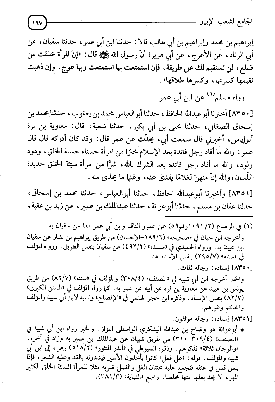 8350 - أَخْبَرَنَا أَبُو عَبْدِ اللهِ الْحَافِظُ، نا أَبُو الْعَبَّاسِ مُحَمَّدُ بْنُ يَعْقُوبَ، نا مُحَمَّدُ بْنُ إِسْحَاقَ الصَّغَانِيُّ، نا يَحْيَى بْنُ أَبِي كَثِيرٍ، نا شُعْبَةُ، قَالَ: مُعَاوِيَةُ بْنُ قُرَّةَ أَبُو إِيَاسٍ، أَخْبَرَنِي قَالَ: سَمِعْتُ أَبِي يُحَدِّثُ، عَنْ عُمَرَ، قَالَ: وَقَدْ كَانَ أَدْرَكَهُ، قَالَ: قَالَ عُمَرُ: §" وَاللهِ مَا أَفَادَ رَجُلٌ فَائِدَةً بَعْدَ الْإِسْلَامِ خَيْرًا مِنِ امْرَأَةٍ حَسْنَاءَ حَسَنَةِ الْخُلُقِ، وَدُودٌ وَلُودٌ، وَاللهِ مَا أَفَادَ رَجُلٌ فَائِدَةً بَعْدَ الشِّرْكِ بِاللهِ شَرًّا مِنْ سُرِّيَّةٍ سَيِّئَةِ الْخُلُقِ حَدِيدَةِ اللِّسَانِ، وَاللهِ إِنَّ مِنْهُنَّ لَغِلًّا مًا يُفْدَى، وَغِنًى مَا وُعِدَ مِنْهُ "