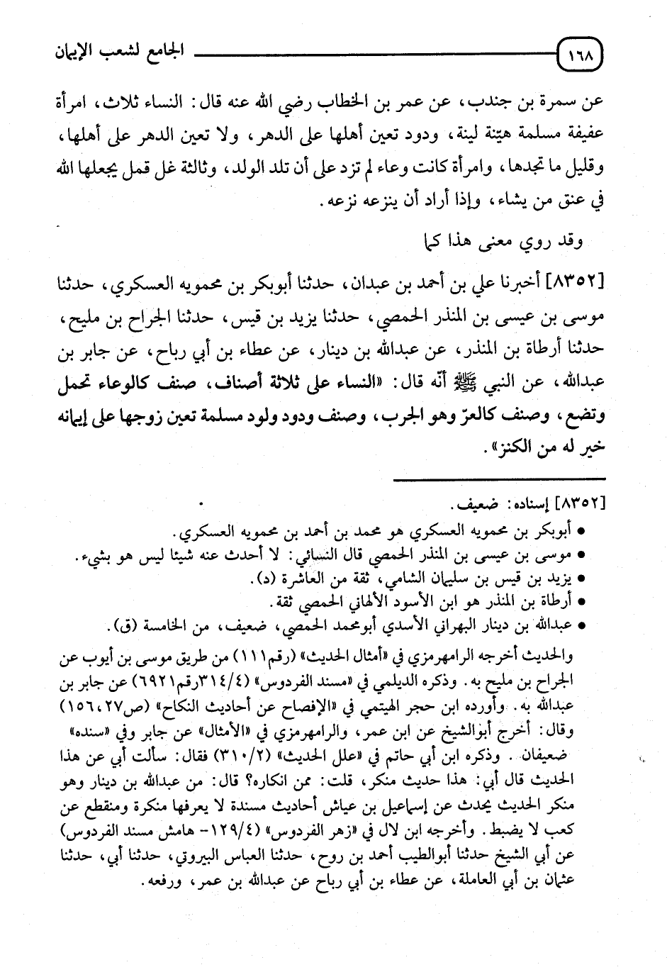 8352 - أَخْبَرَنَا عَلِيُّ بْنُ أَحْمَدَ بْنِ عَبْدَانَ، نا أَبُو بَكْرِ بْنُ مَحْمَوَيْهِ الْعَسْكَرِيُّ، نا مُوسَى بْنُ عِيسَى بْنِ الْمُنْذِرِ الْحِمْصِيُّ، نا زَيْدُ بْنُ قَيْسٍ، نا الْجَرَّاحُ بْنُ مَلِيحٍ، عَنْ أَرْطَأَةَ بْنِ الْمُنْذِرِ، عَنْ عَبْدِ اللهِ بْنِ دِينَارٍ، عَنْ عَطَاءِ بْنِ أَبِي رَبَاحٍ، عَنْ جَابِرِ بْنِ عَبْدِ اللهِ، عَنِ النَّبِيِّ صَلَّى اللَّهُ عَلَيْهِ وَسَلَّمَ، أَنَّهُ قَالَ: " §النِّسَاءُ عَلَى ثَلَاثَةِ أَصْنَافٍ: صِنْفٍ كَالْوِعَاءِ تَحْمِلُ وَتَضَعُ، وَصِنْفٍ كَالْعَرِّ وَهُوَ الْجَرَبُ، وَضُعَفٌ وَدُودٌ وَلُودٌ مُسْلِمَةٌ تُعِينُ زَوْجَهَا عَلَى إِيمَانِهِ خَيْرٌ لَهُ مِنَ الْكَنْزِ "