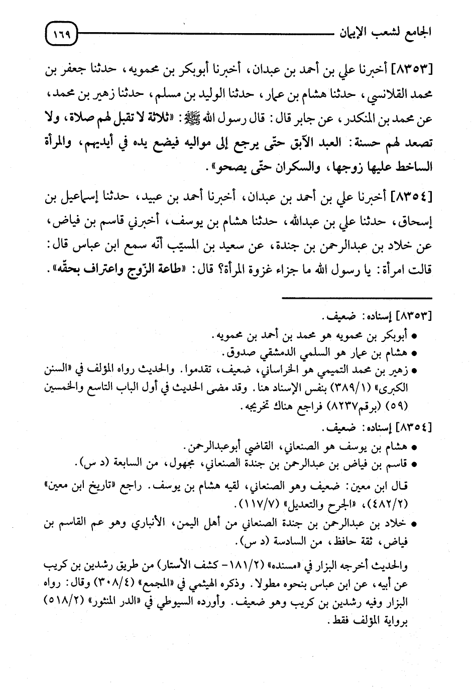 8353 - أَخْبَرَنَا عَلِيُّ بْنُ أَحْمَدَ بْنِ عَبْدَانَ، أنا أَبُو بَكْرِ بْنُ مَحْمَوَيْهِ، نا جَعْفَرُ بْنُ مُحَمَّدٍ الْقَلَانِسِيُّ، نا هِشَامُ بْنُ عَمَّارٍ، نا الْوَلِيدُ بْنُ مُسْلِمٍ، نا زُهَيْرُ بْنُ مُحَمَّدٍ، عَنْ مُحَمَّدِ بْنِ الْمُنْكَدِرِ، عَنْ جَابِرٍ، قَالَ: قَالَ رَسُولُ اللهِ صَلَّى اللَّهُ عَلَيْهِ وَسَلَّمَ: " §ثَلَاثَةٌ لَا تُقْبَلُ لَهُمْ صَلَاةٌ، وَلَا تَصْعَدُ لَهُمْ حَسَنَةٌ: الْعَبْدُ الْآبِقُ حَتَّى يَرْجِعَ إِلَى مَوَالِيهِ فَيَضَعَ يَدَهُ فِي أَيْدِيهِمْ، وَالْمَرْأَةُ السَّاخِطُ عَلَيْهَا زَوْجُهَا، وَالسَّكْرَانُ حَتَّى يَصْحُوَ "