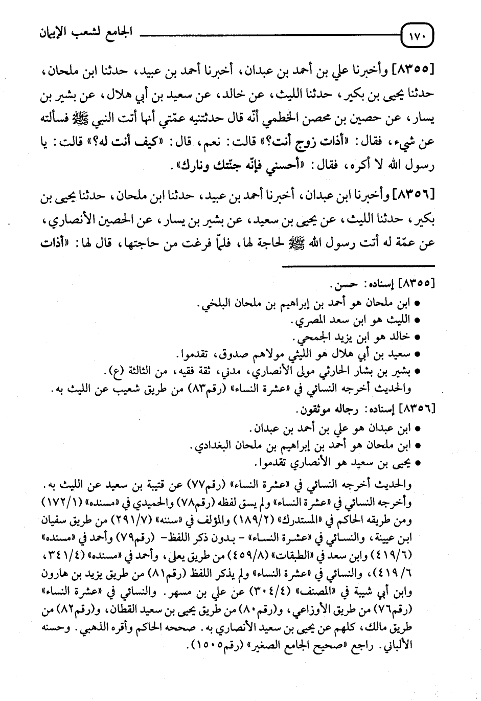 8356 - وَأَخْبَرَنَا ابْنُ عَبْدَانَ، أنا أَحْمَدُ بْنُ عُبَيْدٍ، نا حَمَدُ بْنُ مِلْحَانَ، نا يَحْيَى بْنُ بُكَيْرٍ، نا اللَّيْثُ، عَنْ يَحْيَى بْنِ سَعِيدٍ، عَنْ بَشِيرِ بْنِ يَسَارٍ، عَنِ الْحُصَيْنِ الْأَنْصَارِيِّ، عَنْ عَمَّةٍ لَهُ، أَتَتِ النَّبِيَّ صَلَّى اللَّهُ عَلَيْهِ وَسَلَّمَ لِحَاجَةٍ لَهَا، فَلَمَّا فَرَغَتْ مِنْ حَاجَتِهَا، قَالَ لَهَا: " §أَذَاتُ -[171]- زَوْجٍ أَنْتِ؟ " قَالَتْ: نَعَمْ، فَقَالَ: " كَيْفَ أَنْتِ لَهُ "؟ قَالَتْ: مَا آلُو، إِلَّا مَا عَجَزْتُ عَنْهُ، قَالَ: " انْظُرِي أَيْنَ أَنْتِ مِنْهُ، فَإِنَّهُ جَنَّتُكِ وَنَارُكِ " وَرَوَاهُ أَيْضًا عَبْدُ الرَّحِيمِ بْنُ سُلَيْمَانَ، عَنْ يَحْيَى بْنِ سَعِيدٍ، عَنْ بَشِيرِ بْنِ يَسَارٍ، أَنَّ الْحُصَيْنَ بْنَ مِحْصَنٍ الْأَنْصَارِيَّ، أَخْبَرَهُ أَنَّ عَمَّتَهُ أَخْبَرَتْهُ، أَنَّهَا أَتَتِ النَّبِيَّ صَلَّى اللَّهُ عَلَيْهِ وَسَلَّمَ فِي حَاجَةٍ فَذَكَرَهُ،