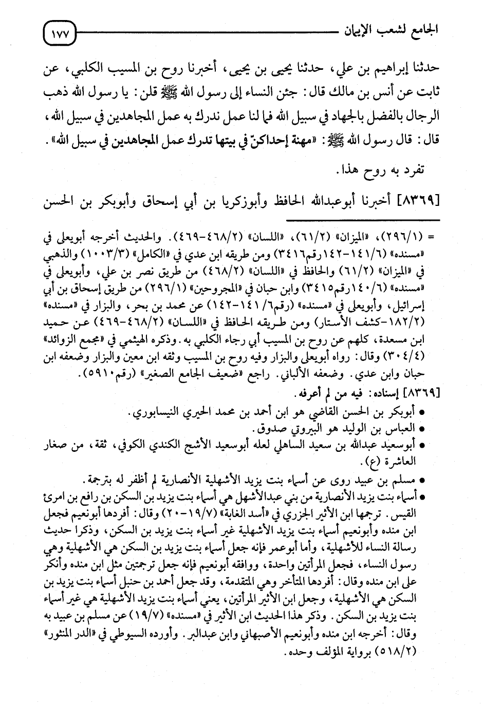 8369 - أَخْبَرَنَا أَبُو عَبْدِ اللهِ الْحَافِظُ، وَأَبُو زَكَرِيَّا بْنُ أَبِي إِسْحَاقَ، وَأَبُو بَكْرِ بْنُ الْحَسَنِ -[178]- الْقَاضِي، قَالُوا: أنا أَبُو الْعَبَّاسِ مُحَمَّدُ بْنُ يَعْقُوبَ، قَالَ: قُرِئَ عَلَى الْعَبَّاسِ بْنِ الْوَلِيدِ وَأَنَا أَسْمَعُ، قِيلَ لَكُمْ: حَدَّثَكُمْ أَبُو سَعِيدٍ السَّاحِليُّ وَهُوَ عَبْدُ اللهِ بْنُ سَعِيدٍ، نا مُسْلِمُ بْنُ عُبَيْدٍ، عَنْ أَسْمَاءَ بِنْتِ يَزِيدَ الْأَنْصَارِيَّةِ مِنْ بَنِي عَبْدِ الْأَشْهَلِ، أَنَّهَا أَتَتِ النَّبِيَّ صَلَّى اللَّهُ عَلَيْهِ وَسَلَّمَ وَهُوَ بَيْنَ أَصْحَابِهِ، فَقَالَتْ: بِأَبِي أَنْتَ وَأُمِّي، إِنِّي وَافِدَةُ النِّسَاءِ إِلَيْكَ، وَاعْلَمْ - نَفْسِي لَكَ الْفِدَاءُ - أَمَا إِنَّهُ مَا مِنِ امْرَأَةٍ كَائِنَةٍ فِي شَرْقٍ وَلَا غَرْبٍ سَمِعَتْ بِمَخْرَجِي هَذَا أَوْ لَمْ تَسْمَعْ إِلَّا وَهِيَ عَلَى مِثْلِ رَأْيِي، إِنَّ اللهَ بَعَثَكَ بِالْحَقِّ إِلَى الرِّجَالِ وَالنِّسَاءِ فَآمَنَّا بِكَ وَبِإِلَاهِكَ الَّذِي أَرْسَلَكَ، وَإِنَّا مَعْشَرَ النِّسَاءِ مَحْصُورَاتٌ مَقْصُورَاتٌ، قَوَاعِدُ بُيُوتِكُمْ، وَمَقْضَى شَهَوَاتِكُمْ، وَحَامِلَاتُ أَوْلَادِكُمْ، وَإِنَّكُمْ §مَعَاشِرَ الرِّجَالِ فُضِّلْتُمْ عَلَيْنَا بِالْجُمُعَةِ وَالْجَمَاعَاتِ، وَعِيَادَةِ الْمَرْضَى، وَشُهُودِ الْجَنَائِزِ، وَالْحَجِّ بَعْدَ الْحَجِّ، وَأَفْضَلُ مِنْ ذَلِكَ الْجِهَادُ فِي سَبِيلِ اللهِ، وَإِنَّ الرَّجُلَ مِنْكُمْ إِذَا أُخْرِجَ حَاجًّا أَوْ مُعْتَمِرًا وَمُرَابِطًا حَفِظْنَا لَكُمْ أَمْوَالَكُمْ، وَغَزَلْنَا لَكُمْ أَثْوَابًا، وَرَبَّيْنَا لَكُمْ أَوْلَادَكُمْ، فَمَا نُشَارِكُكُمْ فِي الْأَجْرِ يَا رَسُولَ اللهِ؟ قَالَ: فَالْتَفَتَ النَّبِيُّ صَلَّى اللَّهُ عَلَيْهِ وَسَلَّمَ إِلَى أَصْحَابِهِ بِوَجْهِهِ كُلِّهِ، ثُمَّ قَالَ: " هَلْ سَمِعْتُمْ مَقَالَةَ امْرَأَةٍ قَطُّ أَحْسَنَ مِنْ مَسْأَلَتِهَا فِي أَمْرِ دِينِهَا مِنْ هَذِهِ؟ " فَقَالُوا: يَا رَسُولَ اللهِ، مَا ظَنَنَّا أَنَّ امْرَأَةً تَهْتَدِي إِلَى مِثْلِ هَذَا، فَالْتَفَتَ النَّبِيُّ صَلَّى اللَّهُ عَلَيْهِ وَسَلَّمَ إِلَيْهَا، ثُمَّ قَالَ لَهَا: " انْصَرِفِي أَيَّتُهَا الْمَرْأَةُ، وَأَعْلِمِي مَنْ خَلْفَكِ مِنَ النِّسَاءِ أَنَّ حُسْنَ تَبَعُّلِ إِحْدَاكُنَّ لِزَوْجِهَا، وَطَلَبَهَا مَرْضَاتِهِ، وَاتِّبَاعَهَا مُوَافَقَتَهُ تَعْدِلُ ذَلِكَ كُلَّهُ " قَالَ: فَأَدْبَرَتِ الْمَرْأَةُ وَهِيَ تُهَلِّلُ وَتُكَبِّرُ اسْتِبْشَارًا