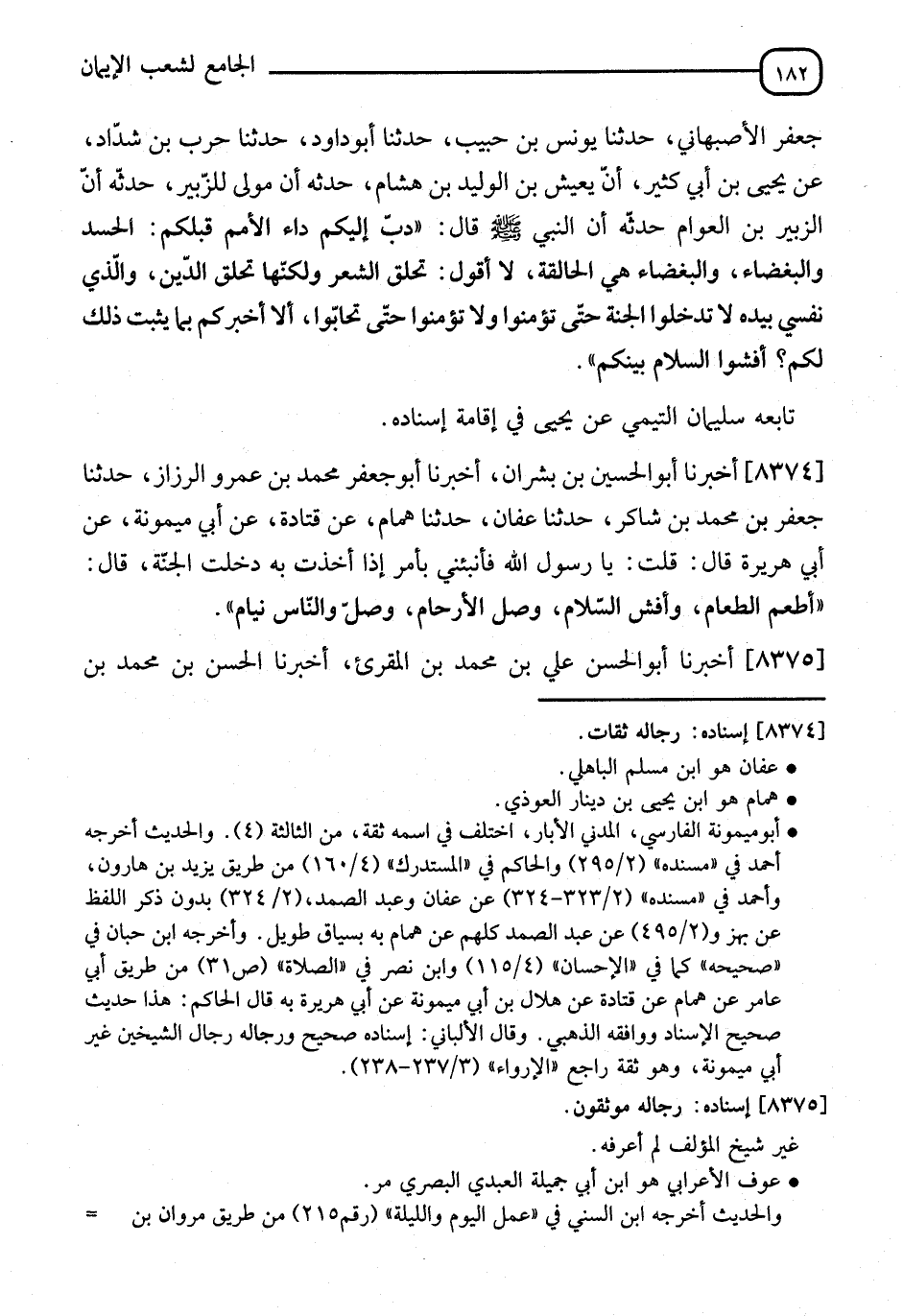 8374 - أَخْبَرَنَا أَبُو الْحُسَيْنِ بْنُ بِشْرَانَ، قَالَ: أنا أَبُو جَعْفَرٍ مُحَمَّدُ بْنُ عَمْرٍو الرَّزَّازُ، قَالَ: نا جَعْفَرُ بْنُ مُحَمَّدِ بْنِ شَاكِرٍ، قَالَ: نا عَفَّانُ، قَالَ: نا هَمَّامٌ، عَنْ قَتَادَةَ، عَنْ أَبِي مَيْمُونٍ، عَنْ أَبِي هُرَيْرَةَ، قَالَ: قُلْتُ: يَا رَسُولَ اللهِ، §فَأَنْبِئْنِي بِأَمْرٍ إِذَا أَخَذْتُ بِهِ دَخَلْتُ الْجَنَّةَ؟ قَالَ: " أَطْعِمِ الطَّعَامَ، وَأَفْشِ السَّلَامَ، وَصِلِ الْأَرْحَامَ، وَصَلِّ بِاللَّيْلِ وَالنَّاسُ نِيَامٌ "