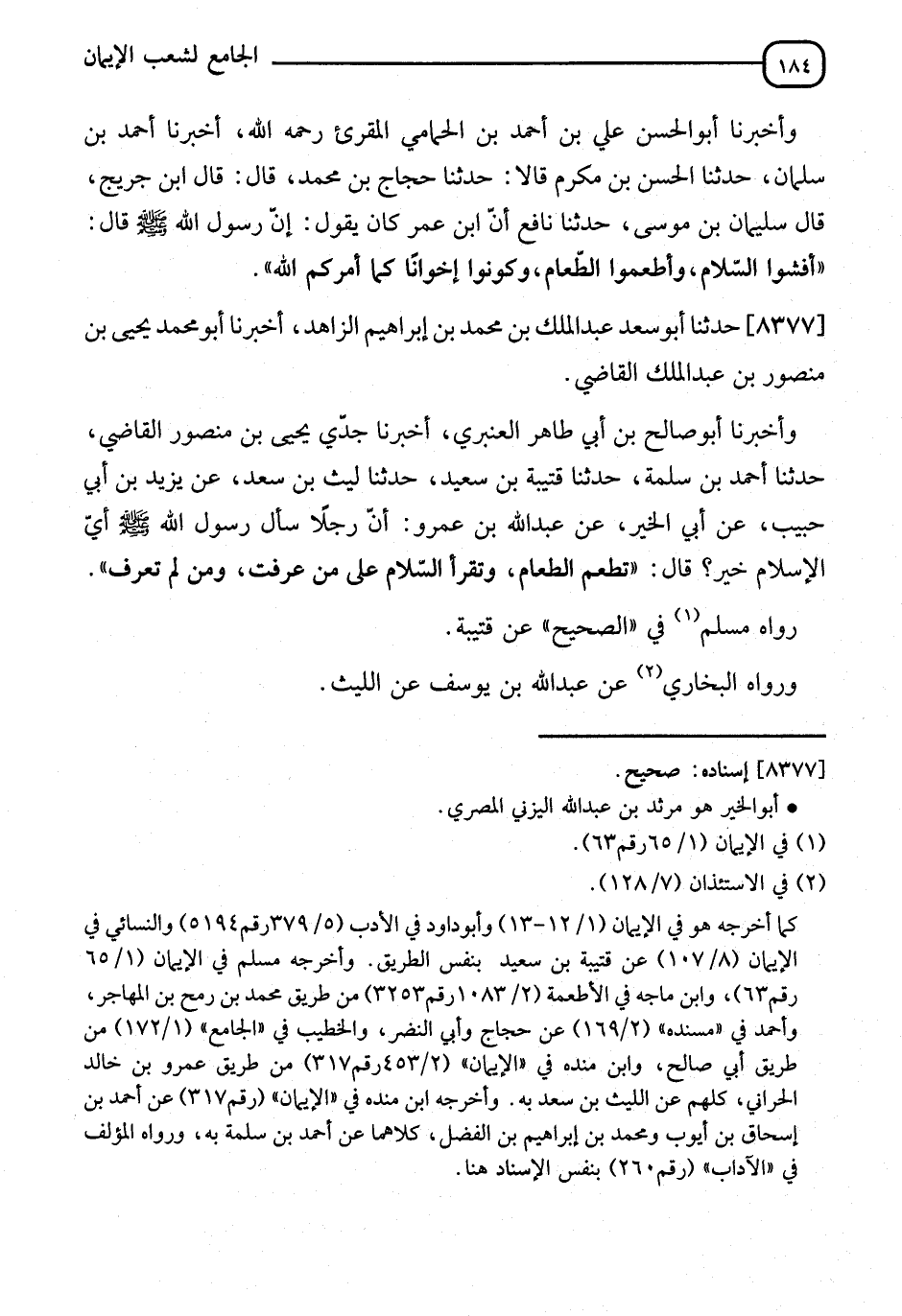 8377 - حَدَّثَنَا أَبُو سَعْدٍ عَبْدُ الْمَلِكِ بْنُ مُحَمَّدِ بْنِ إِبْرَاهِيمَ الزَّاهِدُ، قَالَ: أنا أَبُو مُحَمَّدٍ يَحْيَى بْنُ مَنْصُورِ بْنِ عَبْدِ الْمَلِكِ الْقَاضِي، وَأَخْبَرَنَا أَبُو صَالِحِ بْنُ أَبِي طَاهِرٍ الْعَنْبَرِيُّ، قَالَ: أنا جَدِّي يَحْيَى بْنُ مَنْصُورٍ الْقَاضِي، قَالَ: نا أَحْمَدُ بْنُ سَلَمَةَ، قَالَ: نا قُتَيْبَةُ بْنُ سَعِيدٍ، قَالَ: نا لَيْثُ بْنُ سَعْدٍ، عَنْ يَزِيدَ بْنِ أَبِي حَبِيبٍ، عَنْ أَبِي الْخَيْرِ، عَنْ عَبْدِ اللهِ بْنِ عَمْرٍو، أَنَّ رَجُلًا سَأَلَ رَسُولَ اللهِ صَلَّى اللَّهُ عَلَيْهِ وَسَلَّمَ: §أَيُّ الْإِسْلَامِ خَيْرٌ؟ قَالَ: " تُطْعِمُ الطَّعَامَ، وَتُفْشِي السَّلَامَ عَلَى مَنْ عَرَفْتَ وَمَنْ لَمْ تَعْرِفْ " رَوَاهُ مُسْلِمٌ فِي الصَّحِيحِ، عَنْ قُتَيْبَةَ، وَرَوَاهُ الْبُخَارِيُّ، عَنْ عَبْدِ اللهِ بْنِ يُوسُفَ، عَنِ اللَّيْثِ