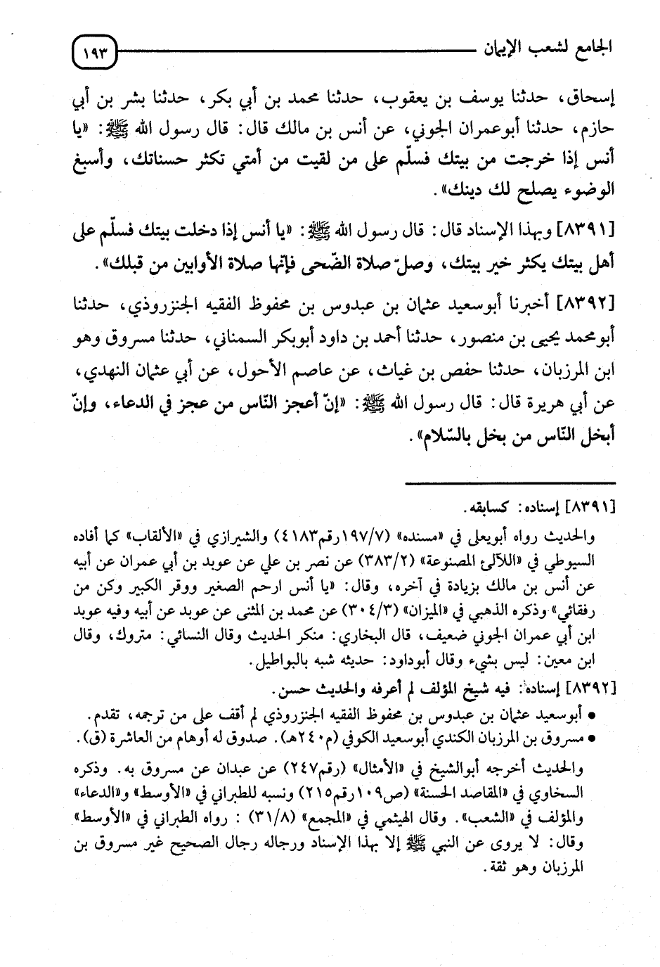 8392 - أَخْبَرَنَا أَبُو سَعِيدٍ عُثْمَانُ بْنُ عُبْدُوسِ بْنِ مَحْفُوظٍ الْفَقِيهُ الْجَنْزَزُوذِيُّ، قَالَ: نا أَبُو مُحَمَّدٍ يَحْيَى بْنُ مَنْصُورٍ، قَالَ: نا أَحْمَدُ بْنُ دَاوُدَ أَبُو بَكْرٍ السِّمْنَانِيُّ، قَالَ: نا مَسْرُوقٌ وَهُوَ ابْنُ الْمَرْزُبَانِ، قَالَ: نا حَفْصُ بْنُ غِيَاثٍ، عَنْ عَاصِمٍ الْأَحْوَلِ، عَنْ أَبِي عُثْمَانَ النَّهْدِيِّ، عَنْ أَبِي هُرَيْرَةَ، قَالَ: قَالَ رَسُولُ اللهِ صَلَّى اللَّهُ عَلَيْهِ وَسَلَّمَ: " إِنَّ §أَعْجَزَ النَّاسِ مَنْ عَجَزَ فِي الدُّعَاءِ، وَإِنَّ أَبْخَلَ النَّاسِ مَنْ بَخِلَ بِالسَّلَامِ " -[194]-