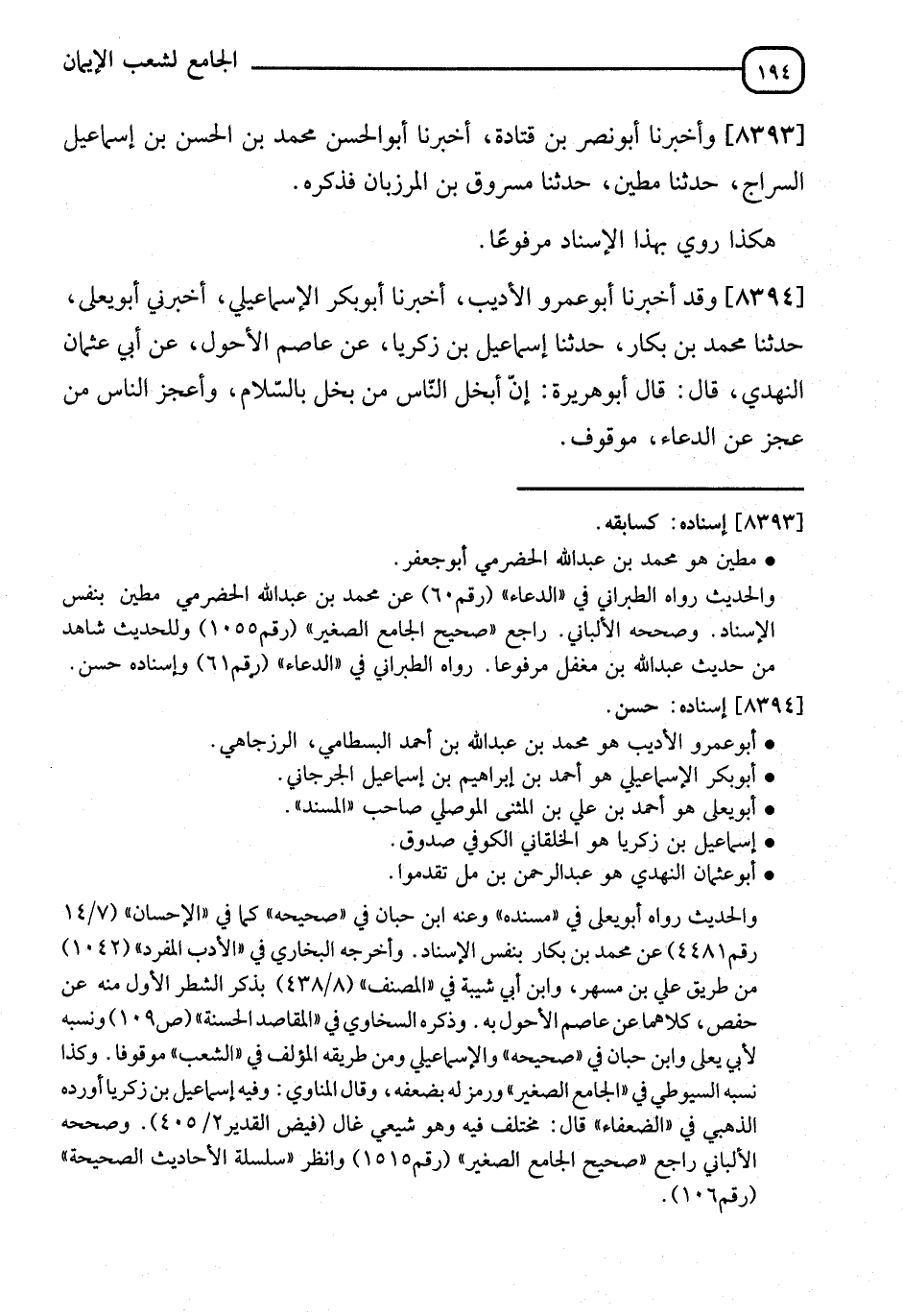 8394 - وَقَدْ أَخْبَرَنَا أَبُو عَمْرِو بْنُ الْأَدِيبِ، قَالَ: نا أَبُو بَكْرٍ الْإِسْمَاعِيلِيُّ، قَالَ: أَخْبَرَنِي أَبُو يَعْلَى، قَالَ: نا مُحَمَّدُ بْنُ بَكَّارٍ، قَالَ: نا إِسْمَاعِيلُ بْنُ زَكَرِيَّا، عَنْ عَاصِمٍ الْأَحْوَلِ، عَنْ أَبِي عُثْمَانَ النَّهْدِيِّ، قَالَ: وَقَالَ أَبُو هُرَيْرَةَ: " إِنَّ §أَبْخَلَ النَّاسِ مَنْ بَخِلَ بِالسَّلَامِ، وَأَعْجَزَ النَّاسِ مَنْ عَجَزَ عَنِ الدُّعَاءِ " مَوْقُوفٌ