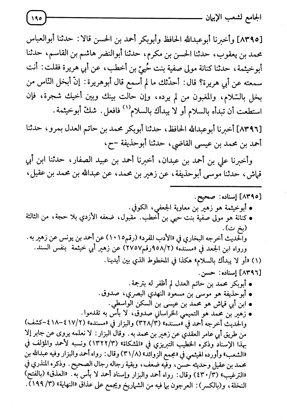 8395 - وَأَخْبَرَنَا أَبُو عَبْدِ اللهِ الْحَافِظُ، وَأَبُو بَكْرٍ أَحْمَدُ بْنُ الْحَسَنِ، قَالَا: نا أَبُو الْعَبَّاسِ مُحَمَّدُ بْنُ يَعْقُوبَ، قَالَ: نا الْحَسَنُ بْنُ مُكْرَمٍ، قَالَ: نا أَبُو النَّضْرِ هَاشِمُ بْنُ الْقَاسِمِ، نا أَبُو خَيْثَمَةَ، قَالَ: نا كِنَانَةُ مَوْلَى صَفِيَّةَ بِنْتِ حُيَيِّ بْنِ أَخْطَبَ، عَنْ أَبِي هُرَيْرَةَ، فَقُلْتُ: أَنْتَ سَمِعْتَ مِنْ أَبِي هُرَيْرَةَ؟ قَالَ: أُحَدِّثُكَ مَا لَمْ أَسْمَعْ؟ قَالَ أَبُو هُرَيْرَةَ: " إِنَّ §أَبْخَلَ النَّاسِ مَنْ بَخِلَ بِالسَّلَامِ، وَالْمَغْبُونُ مَنْ لَمْ يَرُدَّهُ، وَإِنْ حَالَتْ بَيْنَكَ وَبَيْنَ أَخِيكَ شَجَرَةٌ فَإِنِ اسْتَطَعْتَ أَنْ تَبْدَأَهُ بِالسَّلَامِ - أَوْ لَا يَبْدَأَكَ بِالسَّلَامِ - فَافْعَلْ ". شَكَّ أَبُو خَيْثَمَةَ