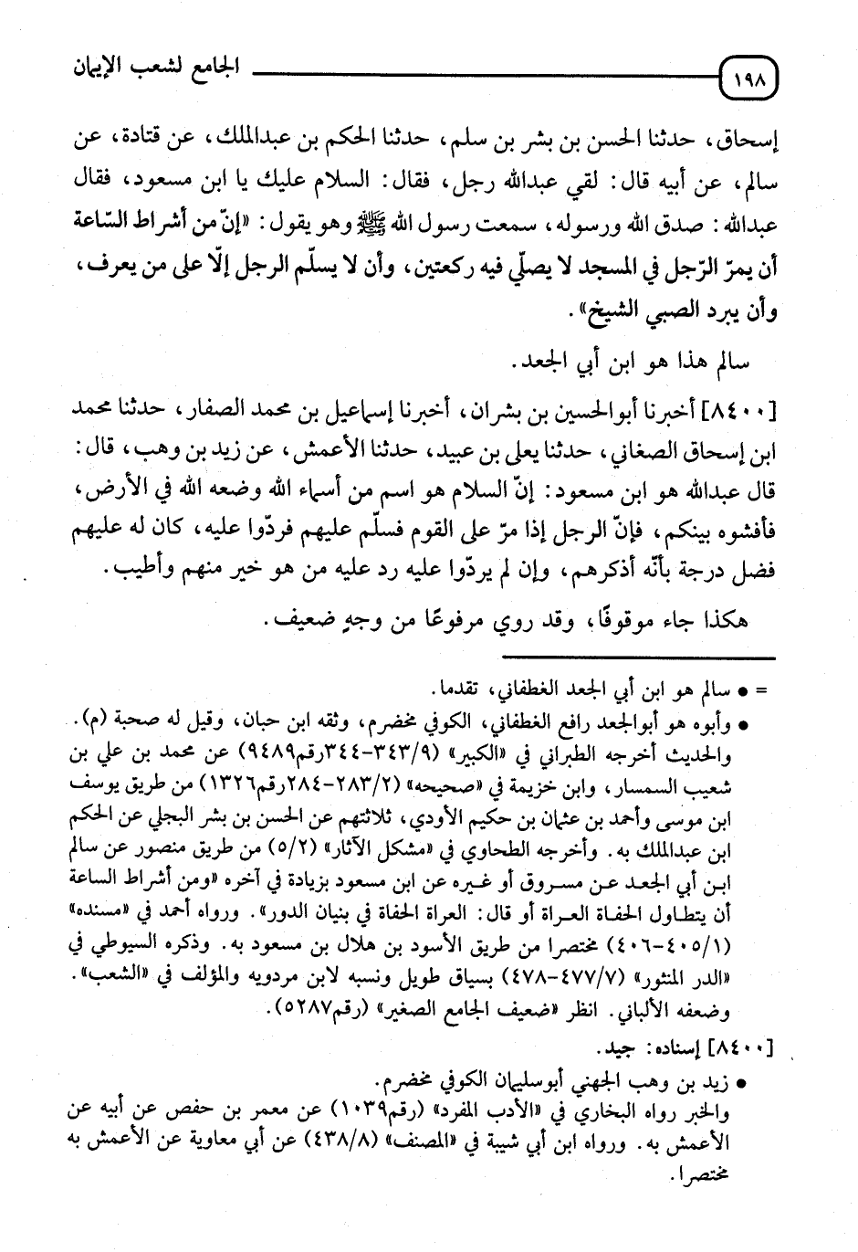 8400 - أَخْبَرَنَا أَبُو الْحُسَيْنِ بْنُ بِشْرَانَ، قَالَ: أنا إِسْمَاعِيلُ بْنُ مُحَمَّدٍ الصَّفَّارُ، قَالَ: نا مُحَمَّدُ بْنُ إِسْحَاقَ الصَّغَانِيُّ، قَالَ: نا يَعْلَى بْنُ عُبَيْدٍ، قَالَ: نا الْأَعْمَشُ، عَنْ زَيْدِ بْنِ وَهْبٍ، قَالَ: قَالَ عَبْدُ اللهِ هُوَ ابْنُ مَسْعُودٍ: " إِنَّ §السَّلَامَ هُوَ اسْمٌ مِنْ أَسْمَاءِ اللهِ تَعَالَى وَضَعَهُ اللهُ فِي الْأَرْضِ، فَأَفْشُوهُ بَيْنَكُمْ، فَإِنَّ الرَّجُلَ إِذَا مَرَّ عَلَى الْقَوْمِ فَسَلَّمَ عَلَيْهِمْ فَرَدُّوا عَلَيْهِ كَانَ لَهُ عَلَيْهِمْ فَضْلُ دَرَجَةٍ بِأَنَّهُ أَذْكَرَهُمْ، وَإِنْ لَمْ يَرُدُّوا عَلَيْهِ رَدَّ عَلَيْهِ مَنْ هُوَ خَيْرٌ مِنْهُمْ وَأَطْيَبُ " هَكَذَا جَاءَ مَوْقُوفًا، وَقَدْ رُوِيَ مَرْفُوعًا مِنْ وَجْهٍ ضَعِيفٍ -[199]-