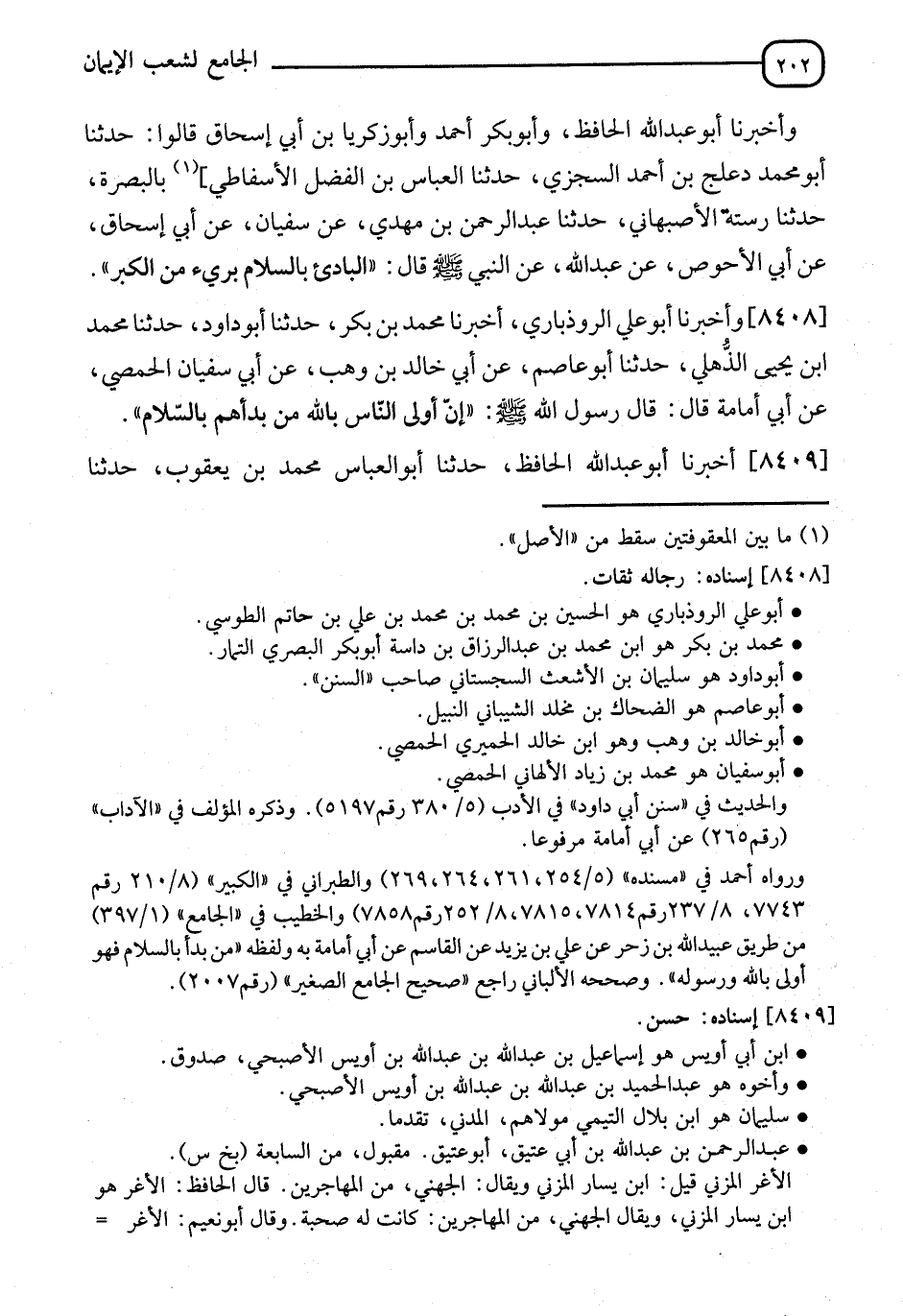 8408 - وَأَخْبَرَنَا أَبُو عَلِيٍّ الرُّوذْبَارِيُّ، قَالَ: أنا مُحَمَّدُ بْنُ بَكْرٍ، قَالَ: نا أَبُو دَاوُدَ، قَالَ: نا مُحَمَّدُ بْنُ يَحْيَى الذُّهْلِيُّ، قَالَ: نا أَبُو عَاصِمٍ، عَنْ أَبِي خَالِدٍ وَهْبٍ، عَنْ أَبِي سُفْيَانَ الْحِمْصِيِّ، عَنْ أَبِي أُمَامَةَ، قَالَ: قَالَ رَسُولُ اللهِ صَلَّى اللَّهُ عَلَيْهِ وَسَلَّمَ: " إِنَّ §أَوْلَى النَّاسِ بِاللهِ مَنْ بَدَأَهُمْ بِالسَّلَامِ "