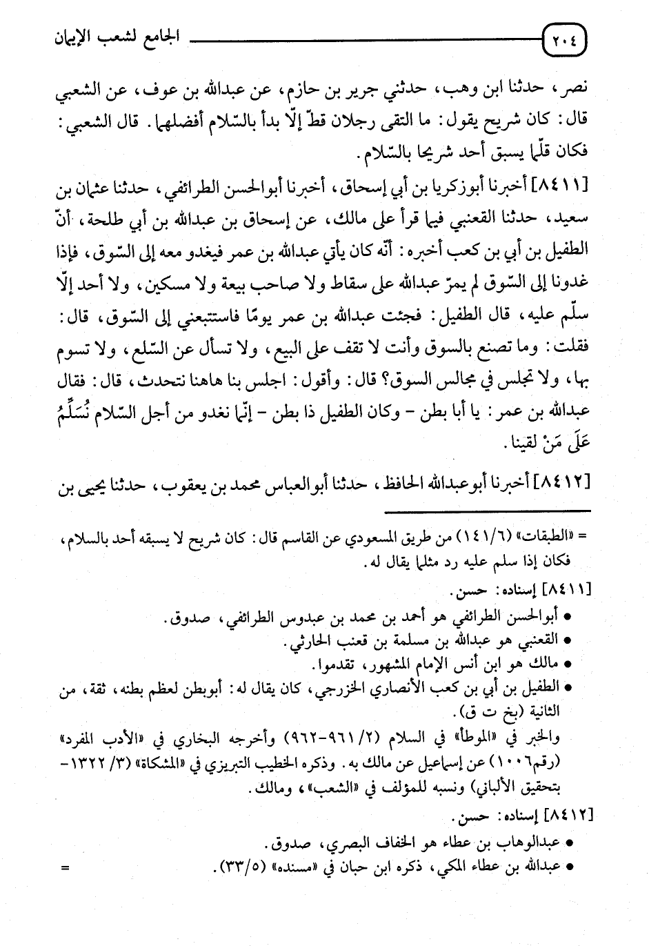 8411 - أَخْبَرَنَا أَبُو زَكَرِيَّا بْنُ أَبِي إِسْحَاقَ، قَالَ: أنا أَبُو الْحَسَنِ الطَّرَائِفِيُّ، قَالَ: نا عُثْمَانُ بْنُ سَعِيدٍ، قَالَ: نا الْقَعْنَبِيُّ، فِيمَا قَرَأَ عَلَى مَالِكٍ، عَنْ إِسْحَاقَ بْنِ عَبْدِ اللهِ بْنِ أَبِي طَلْحَةَ، أَنَّ الطُّفَيْلَ بْنَ أُبَيِّ بْنِ كَعْبٍ أَخْبَرَهُ، أَنَّهُ كَانَ يَأْتِي عَبْدَ اللهِ بْنَ عُمَرَ فَيَغْدُو مَعَهُ إِلَى السُّوقِ، فَإِذَا غَدَوْنَا إِلَى السُّوقِ لَمْ يَمُرَّ عَبْدُ اللهِ عَلَى سَقَاطٍ وَلَا صَاحِبِ بَيْعِهِ، وَلَا مِسْكِينٍ وَلَا أَحَدٍ إِلَّا سَلَّمَ عَلَيْهِمْ، قَالَ الطُّفَيْلُ: فَجِئْتُ عَبْدَ اللهِ بْنَ عُمَرَ يَوْمًا فَاسْتَتْبَعَنِي إِلَى السُّوقِ، قَالَ: فَقُلْتُ: وَمَا تَصْنَعُ بِالسُّوقِ؟ وَإِنَّهُ لَا تَقْفُ عَلَى الْبَيْعِ، وَلَا تَسْأَلُ عَنِ السِّلَعِ، وَلَا تَسُومُ بِهَا، وَلَا تَجْلِسُ فِي مَجَالِسِ السُّوقِ؟ قَالَ: وَأَقُولُ: اجْلِسْ بِنَا ههُنَا نَتَحَدَّثُ، فَقَالَ لِي عَبْدُ اللهِ بْنُ عُمَرَ: " يَا أَبَا بَطْنٍ - وَكَانَ الطُّفَيْلُ ذَا بَطْنٍ -، إِنَّمَا §نَغْدُو مِنْ أَجْلِ السَّلَامِ نُسَلِّمُ عَلَى مَنْ لَقِينَا "