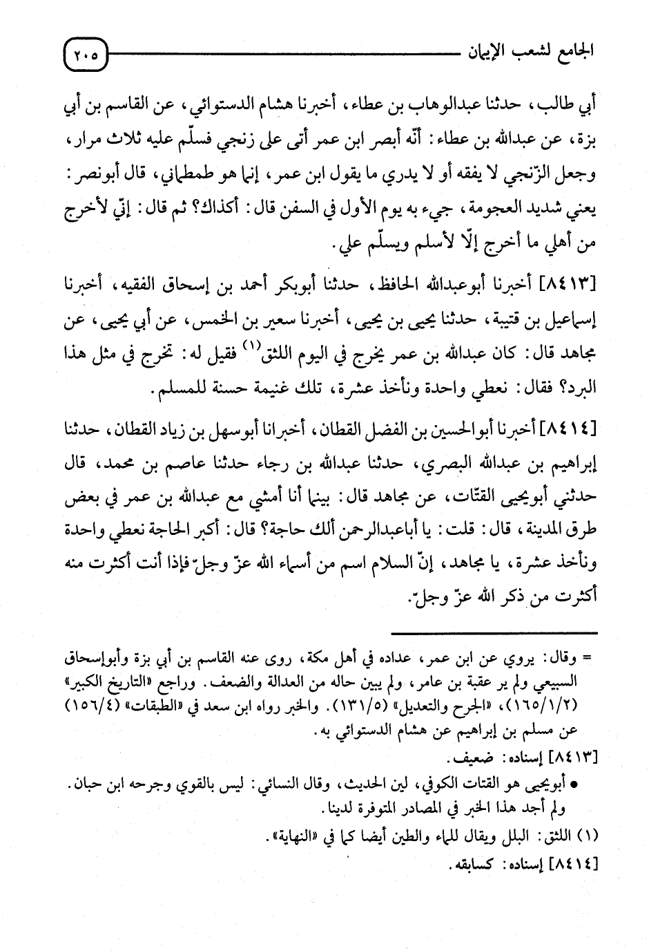8414 - أَخْبَرَنَا أَبُو الْحُسَيْنِ بْنُ الْفَضْلِ الْقَطَّانُ، قَالَ: أنا أَبُو سَهْلِ بْنُ زِيَادٍ الْقَطَّانُ، قَالَ: نا إِبْرَاهِيمُ بْنُ عَبْدِ اللهِ الْبَصْرِيُّ، قَالَ: نا عَبْدُ اللهِ بْنُ رَجَاءٍ، قَالَ: نا عِيَاضُ بْنُ مُحَمَّدٍ، قَالَ: حَدَّثَنِي أَبُو يَحْيَى الْقَتَّاتُ، عَنْ مُجَاهِدٍ، قَالَ: بَيْنَا أَنَا أَمْشِي مَعَ عَبْدِ اللهِ بْنِ عُمَرَ فِي بَعْضِ طُرُقِ الْمَدِينَةِ، قَالَ: قُلْتُ: يَا أَبَا عَبْدِ الرَّحْمَنِ أَلَكَ حَاجَةٌ؟ قَالَ: " أَكْبَرُ الْحَاجَةِ، تُعْطِي وَاحِدَةً وَتَأْخُذُ عَشَرَةً، يَا مُجَاهِدُ، إِنَّ §السَّلَامَ اسْمٌ مِنْ أَسْمَاءِ اللهِ عَزَّ وَجَلَّ، فَإِذَا أَنْتَ أَكْثَرْتَ مِنْهُ أَكْثَرْتَ مِنْ ذِكْرِ اللهِ عَزَّ وَجَلَّ "