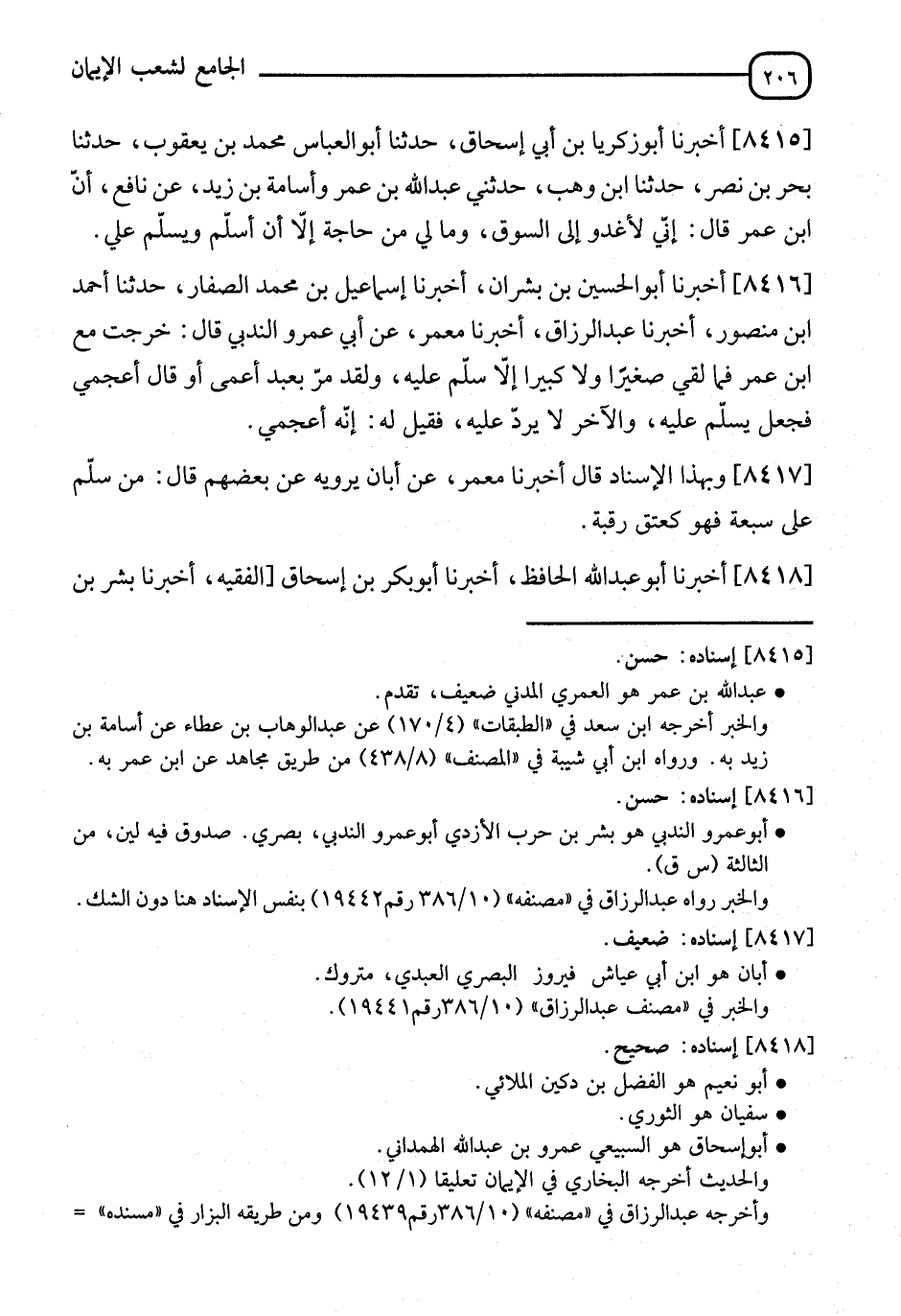 8416 - أَخْبَرَنَا أَبُو الْحُسَيْنِ بْنُ بِشْرَانَ، قَالَ: أنا إِسْمَاعِيلُ بْنُ مُحَمَّدٍ الصَّفَّارُ، قَالَ: نا أَحْمَدُ بْنُ مَنْصُورٍ، قَالَ: أنا عَبْدُ الرَّزَّاقِ، أنا مَعْمَرٌ، عَنْ أَبِي عَمْرٍو النَّدَبِيِّ، قَالَ: خَرَجْتُ مَعَ ابْنِ عُمَرَ " §فَمَا لَقِيَ صَغِيرًا وَلَا كَبِيرًا إِلَّا سَلَّمَ عَلَيْهِ، وَلَقَدْ مَرَّ بِعَبْدٍ أَعْمَى أَوْ قَالَ: أَعْجَمِيٌّ، فَجَعَلَ يُسَلِّمُ عَلَيْهِ وَالْآخَرُ لَا يَرُدُّ عَلَيْهِ، فَقِيلَ لَهُ: إِنَّهُ أَعْجَمِيٌّ "