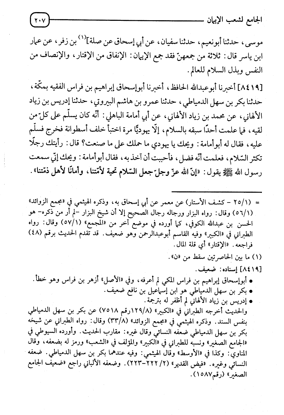 8419 - أَخْبَرَنَا أَبُو عَبْدِ اللهِ الْحَافِظُ، قَالَ: أنا أَبُو إِسْحَاقَ إِبْرَاهِيمُ بْنُ فِرَاسٍ الْفَقِيهُ بِمَكَّةَ، قَالَ: نا بَكْرُ بْنُ سَهْلٍ الدِّمْيَاطِيُّ، قَالَ: نا عَمْرُو بْنُ هَاشِمٍ الْبَيْرُوتِيُّ، قَالَ: نا إِدْرِيسُ بْنُ زِيَادٍ الْأَلْهَانِيُّ، عَنْ مُحَمَّدِ بْنِ زِيَادٍ الْأَلْهَانِيُّ، عَنْ أَبِي أُمَامَةَ الْبَاهِلِيِّ، أَنَّهُ كَانَ يُسَلِّمُ عَلَى مَنْ لَقِيَهُ، قَالَ: فَمَا عَلِمْتُ أَحَدًا سَبَقَهُ بِالسَّلَامِ، إِلَّا يَهُودِيًّا مَرَّ بِهِ اخْتَبَأَ خَلْفَ أُسْطُوَانَةٍ فَخَرَجَ فَسَلَّمَ عَلَيْهِ، فَقَالَ لَهُ أَبُو أُمَامَةَ: وَيْحَكَ يَا يَهُودِيُّ، مَا حَمَلَكَ عَلَى مَا صَنَعَتَ؟ قَالَ: رَأَيْتُكَ رَجُلًا تُكْثِرُ السَّلَامَ فَعَلِمْتُ أَنَّهُ فَضْلٌ، فَأَحْبَبْتُ أَنْ آخُذَ بِهِ، فَقَالَ أَبُو أُمَامَةَ: وَيْحَكَ، سَمِعْتُ رَسُولَ اللهِ صَلَّى اللَّهُ عَلَيْهِ وَسَلَّمَ يَقُولُ: " إِنَّ §اللهَ عَزَّ وَجَلَّ جَعَلَ السَّلَامَ تَحِيَّةً لِأُمَّتِنَا، وَأَمَانًا لِأَهْلِ ذِمَّتِنَا "