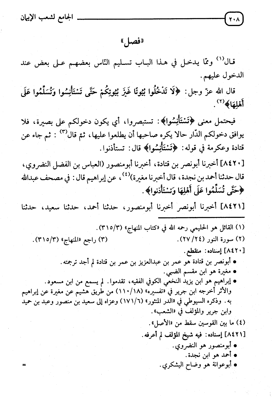 8420 - أَخْبَرَنَا أَبُو نَصْرِ بْنُ قَتَادَةَ، قَالَ: أنا أَبُو مَنْصُورٍ الْعَبَّاسُ بْنُ الْفَضْلِ النَّضْرَوِيُّ، قَالَ: نا أَحْمَدُ بْنُ نَجْدَةَ، قَالَ: أنا مُغِيرَةُ، عَنْ إِبْرَاهِيمَ، قَالَ: فِي مُصْحَفِ عَبْدِ اللهِ: " §حَتَّى تُسَلِّمُوا عَلَى أَهْلِهَا، أَوْ تَسْتَأْذِنُوا "