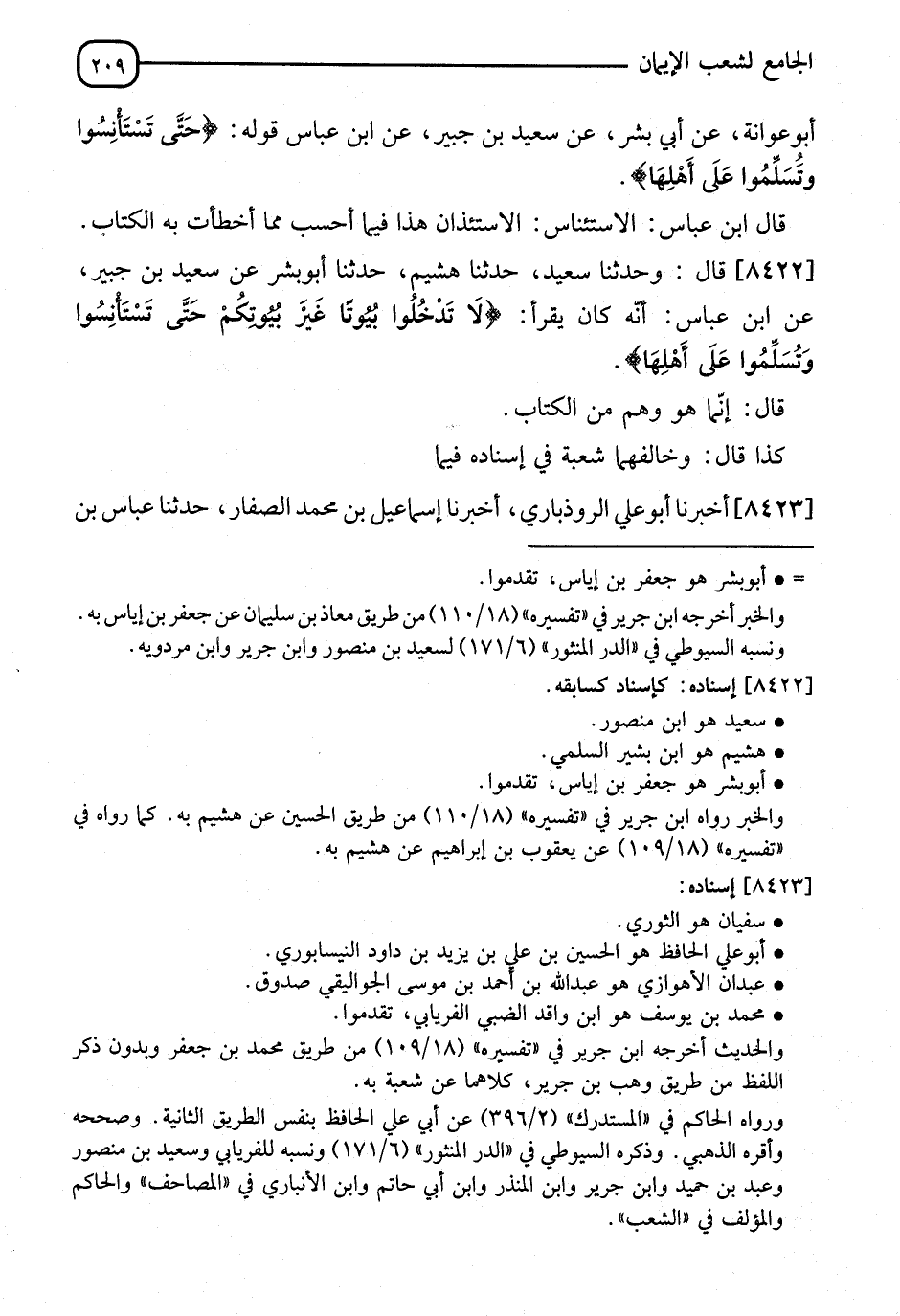 8422 - قَالَ: وَنا سَعِيدٌ، قَالَ: نا هُشَيْمٌ، قَالَ: نا أَبُو بِشْرٍ، عَنْ سَعِيدِ بْنِ جُبَيْرٍ، عَنِ ابْنِ عَبَّاسٍ " أَنَّهُ §كَانَ يَقْرَأُ: (لَا تَدْخُلُوا بُيُوتًا غَيْرَ بُيُوتِكُمْ حَتَّى تَسْتَأْذِنُوا وَتُسَلِّمُوا عَلَى أَهْلِهَا) وَقَالَ: إِنَّمَا هُوَ وَهْمٌ مِنَ الْكُتَّابِ. كَذَا قَالَ: وَخَالَفَهُمَا شُعْبَةُ فِي إِسْنَادِهِ فِيمَا