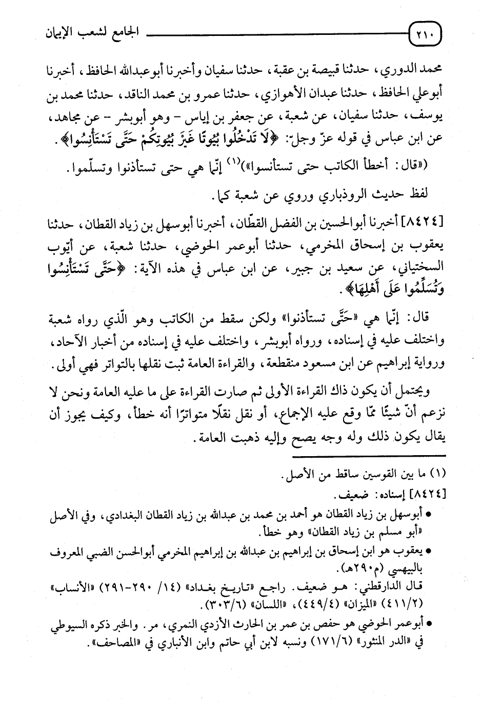 8424 - أَخْبَرَنَا أَبُو الْحُسَيْنِ بْنُ الْفَضْلِ الْقَطَّانُ، قَالَ: أنا أَبُو سَهْلِ بْنُ زِيَادٍ الْقَطَّانُ، قَالَ: نا يَعْقُوبُ بْنُ إِسْحَاقَ الْمَخْرَمِيُّ، قَالَ: نا أَبُو عُمَرَ الْحَوْضِيُّ، قَالَ: نا شُعْبَةُ، عَنْ أَيُّوبَ السَّخْتِيَانِيِّ، عَنْ سَعِيدِ بْنِ جُبَيْرٍ، عَنِ ابْنِ عَبَّاسٍ، فِي هَذِهِ الْآيَةِ: " {§حَتَّى تَسْتَأْنِسُوا وَتُسَلِّمُوا عَلَى أَهْلِهَا} [النور: 27] ". قَالَ: إِنَّمَا هِيَ: حَتَّى تَسْتَأْذِنُوا، وَلَكِنْ سَقَطَ مِنَ الْكَاتِبِ. وَهَذَا الَّذِي رَوَاهُ شُعْبَةُ وَاخْتُلِفَ عَلَيْهِ فِي إِسْنَادِهِ، وَرَوَاهُ أَبُو بِشْرٍ وَاخْتُلِفَ عَلَيْهِ فِي إِسْنَادِهِ مِنْ أَخْبَارِ الْآحَادِ، وَرِوَايَةُ إِبْرَاهِيمَ، عَنِ ابْنِ مَسْعُودٍ مُنْقَطِعَةٌ، وَالْقِرَاءَةُ الْعَامَّةُ ثَبَتَ نَقْلُهَا بِالتَّوَاتُرِ فَهِيَ أَوْلَى، وَيُحْتَمَلُ أَنْ تَكُونَ تِلْكَ الْقِرَاءَةَ الْأُولَى، ثُمَّ صَارَتِ الْقِرَاءَةُ إِلَى مَا عَلَيْهِ الْعَامَّةُ، وَنَحْنُ لَا نَزْعُمُ أَنَّ شَيْئًا مِمَّا وَقَعَ عَلَيْهِ الْإِجْمَاعُ، أَوْ نُقِلَ مُتَوَاتِرًا أَنَّهُ خَطَأٌ، وَكَيْفَ يَجُوزُ أَنْ يُقَالَ ذَلِكَ وَلَهُ وَجْهٌ يَصِحُّ، وَإِلَيْهِ ذَهَبْتِ الْعَامَّةُ؟