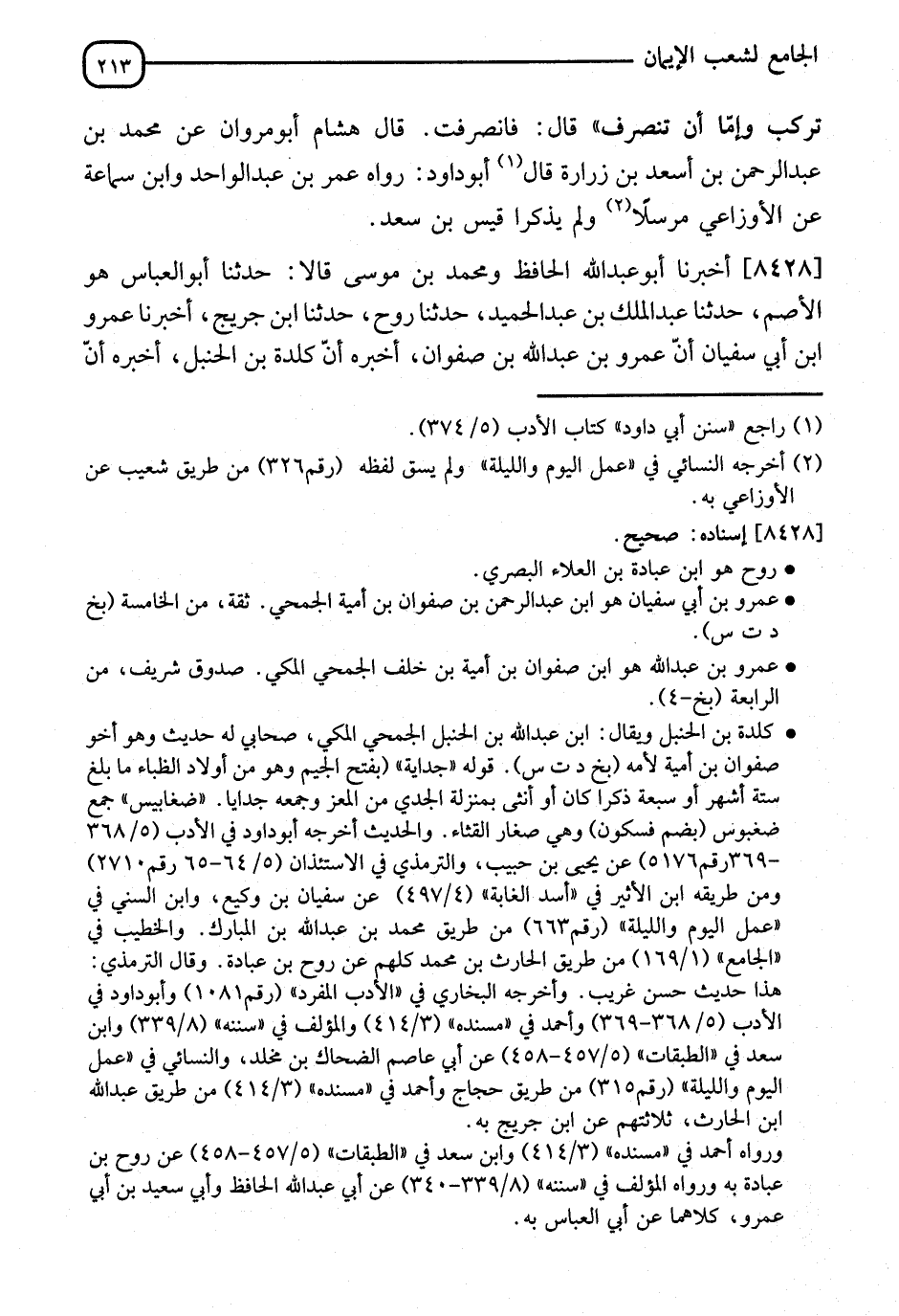 8428 - أَخْبَرَنَا أَبُو عَبْدِ اللهِ الْحَافِظُ، وَمُحَمَّدُ بْنُ مُوسَى، قَالَا: نا أَبُو الْعَبَّاسِ هُوَ الْأَصَمُّ، قَالَ: نا عَبْدُ الْمَلِكِ بْنُ عَبْدِ الْحَمِيدِ، قَالَ: نا رَوْحٌ، قَالَ: نا ابْنُ جُرَيْجٍ، قَالَ: أنا عَمْرُو بْنُ أَبِي سُفْيَانَ، أَنَّ عَمْرَو بْنَ عَبْدِ اللهِ بْنِ صَفْوَانَ، أَخْبَرَهُ، أَنَّ كَلَدَةَ بْنَ الْحَنْبَلِ، أَخْبَرَهُ، أَنَّ -[214]- صَفْوَانَ بْنَ أُمَيَّةَ بَعَثَهُ فِي الْفَتْحِ بِلَبَنٍ وَجَدَايَةٍ وَضَغَابِيسَ وَالنَّبِيُّ صَلَّى اللَّهُ عَلَيْهِ وَسَلَّمَ عَلَى الْوَادِي قَالَ: فَدَخَلْتُ عَلَيْهِ وَلَمْ أُسَلِّمْ، وَلَمْ أَسْتَأْذِنْ، فَقَالَ النَّبِيُّ صَلَّى اللَّهُ عَلَيْهِ وَسَلَّمَ: " §ارْجِعْ فَقُلِ السَّلَامُ عَلَيْكُمْ، أَأَدْخُلُ بَعْدَمَا أَسْلِمْ؟ ". " صَفْوَانُ قَالَ عَمْرٌو: وَأَخْبَرَنِي هَذَا أُمَيَّةُ بْنُ صَفْوَانَ، وَلَمْ يَقُلْ سَمِعَتْهُ مِنْ كَلَدَةَ "