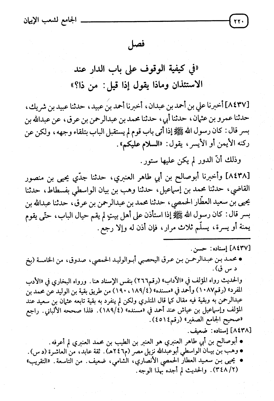 8438 - وَأَخْبَرَنَا أَبُو صَالِحِ بْنُ أَبِي طَاهِرٍ الْعَنْبَرِيُّ، قَالَ: نا جَدِّي يَحْيَى بْنُ مَنْصُورٍ الْقَاضِي، قَالَ: نا مُحَمَّدُ بْنُ إِسْمَاعِيلَ الْإِسْمَاعِيلِيُّ، قَالَ: نا وَهْبُ بْنُ بَيَانٍ الْوَاسِطِيُّ، بِفُسْطَاطَ، قَالَ: نا يَحْيَى بْنُ سَعِيدٍ الْعَطَّارُ الْحِمْصِيُّ، قَالَ: نا مُحَمَّدُ بْنُ عَبْدِ الرَّحْمَنِ بْنِ عِرْقٍ، قَالَ: نا عَبْدُ اللهِ بْنُ بُسْرٍ، قَالَ: كَانَ رَسُولُ اللهِ صَلَّى اللَّهُ عَلَيْهِ وَسَلَّمَ §إِذَا اسْتَأْذَنَ عَلَى أَهْلِ بَيْتٍ لَمْ يَقُمْ حِيَالَ الْبَابِ حَتَّى يَقُومَ يَمْنَةً أَوْ يَسْرَةً، فَيُسَلِّمُ ثَلَاثَ مَرَّاتٍ، فَإِنْ أَذِنَ لَهُ وَإِلَّا رَجَعَ ". -[221]- وَرُوِّينَاهُ عَنْ بَقِيَّةَ بْنِ الْوَلِيدِ، عَنْ مُحَمَّدِ بْنِ عَبْدِ الرَّحْمَنِ، غَيْرَ أَنَّهُ قَالَ: مَشَى مَعَ الْجِدَارِ وَلَمْ يَسْتَقْبِلِ الْبَابَ، وَلَمْ يَذْكُرِ السَّلَامَ، وَزَادَ: وَذَلِكَ أَنَّ الْقَوْمَ لَمْ يَكُنْ لِأَبْوَابِهِمْ سُتُورٌ