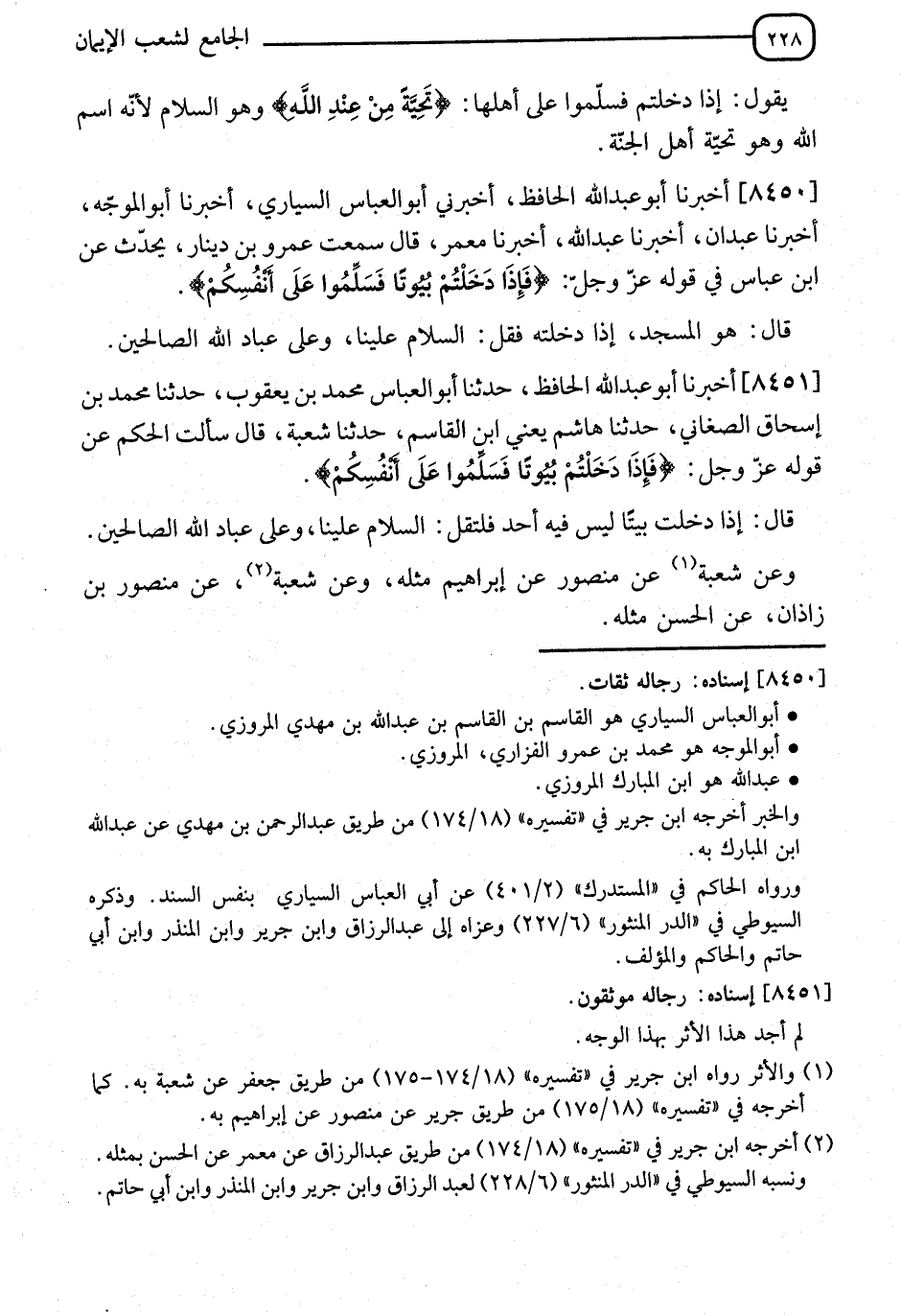 8451 - أَخْبَرَنَا أَبُو عَبْدِ اللهِ الْحَافِظُ، قَالَ: نا أَبُو الْعَبَّاسِ مُحَمَّدُ بْنُ يَعْقُوبَ، قَالَ: نا مُحَمَّدُ بْنُ إِسْحَاقَ الصَّغَانِيُّ، قَالَ: نا شُعْبَةُ، قَالَ: سَأَلْتُ الْحَكَمَ عَنْ قَوْلِهِ عَزَّ وَجَلَّ: {إِذَا دَخَلْتُمْ بُيُوتًا فَسَلِّمُوا}، قَالَ: " §إِذَا دَخَلْتَ بَيْتًا لَيْسَ فِيهِ أَحَدٌ فَلْيَقُلِ: السَّلَامُ عَلَيْنَا، وَعَلَى عِبَادِ اللهِ الصَّالِحِينَ "