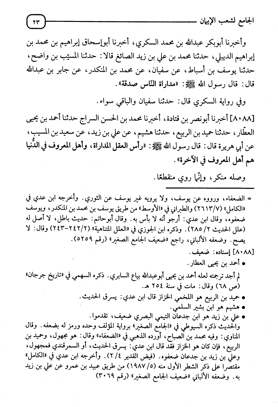 8088 - أَخْبَرَنَا أَبُو نَصْرِ بْنُ قَتَادَةَ، أنا مُحَمَّدُ بْنُ الْحَسَنِ السَّرَّاجُ، نا أَحْمَدُ بْنُ يَحْيَى الْعَطَّارُ، نا حُمَيْدُ بْنُ الرَّبِيعِ، نا هُشَيْمٌ، عَنْ عَلِيِّ بْنِ زَيْدٍ، عَنْ سَعِيدِ بْنِ الْمُسَيِّبِ، عَنْ أَبِي هُرَيْرَةَ، قَالَ: قَالَ رَسُولُ اللهِ صَلَّى اللَّهُ عَلَيْهِ وَسَلَّمَ: " §رَأْسُ الْعَقْلِ الْمُدَارَاةُ، وَأَهْلُ الْمَعْرُوفِ فِي الدُّنْيَا هُمْ أَهْلُ الْمَعْرُوفِ فِي الْآخِرَةِ " وَصْلُهُ مُنْكَرٌ، وَإِنَّمَا يُرْوَى مُنْقَطِعًا