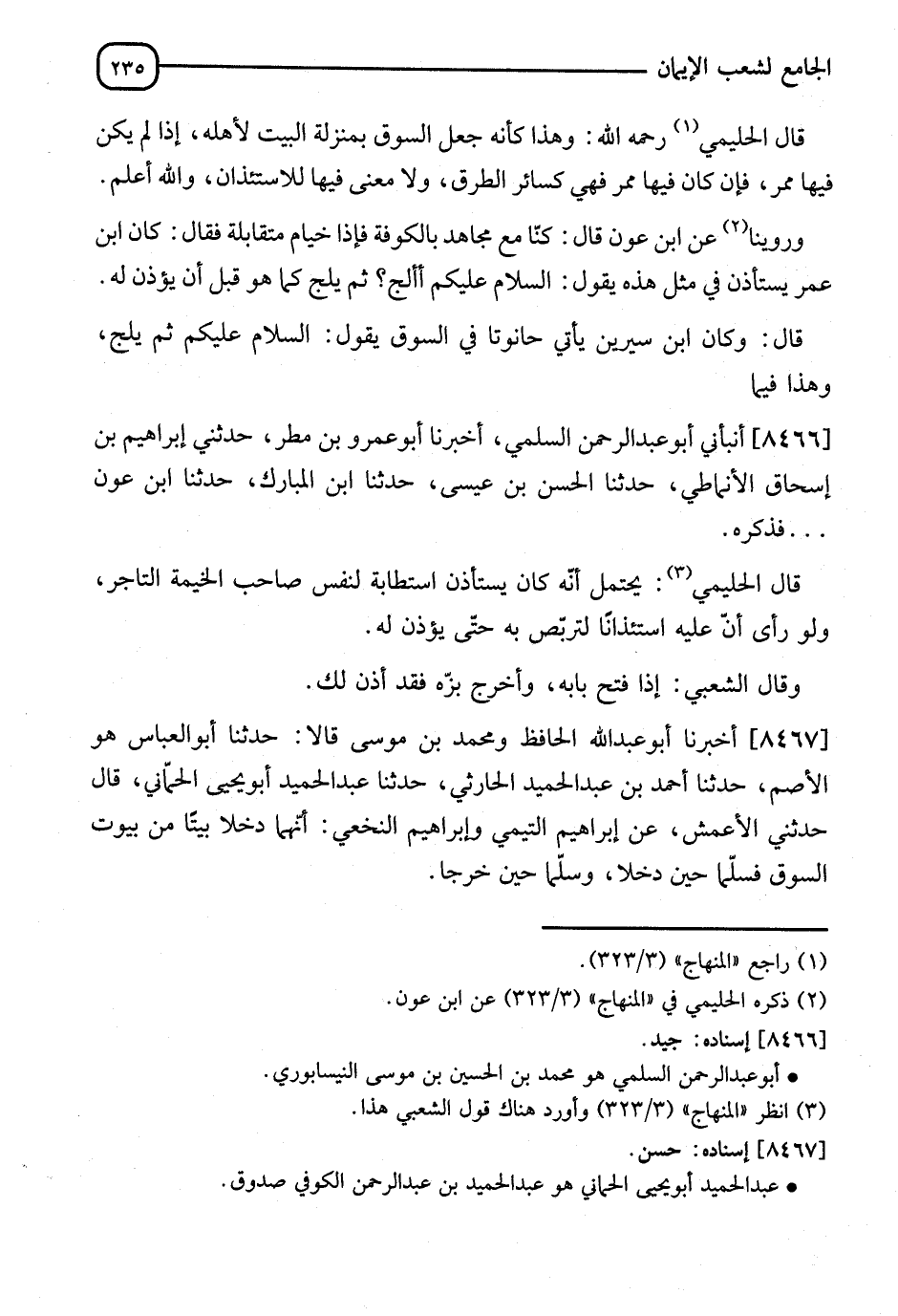 8466وَهَذَا فِيمَا أَنْبَأَنِي أَبُو عَبْدِ الرَّحْمَنِ السُّلَمِيُّ، قَالَ: أنا أَبُو عَمْرِو بْنُ مَطَرٍ، قَالَ: نا إِبْرَاهِيمُ بْنُ إِسْحَاقَ الْأَنْمَاطِيُّ، قَالَ: نا الْحَسَنُ بْنُ عِيسَى، قَالَ: نا ابْنُ الْمُبَارَكِ، قَالَ: أنا ابْنُ عَوْنٍ فَذَكَرَهُ. قَالَ الْحَلِيمِيُّ: " يُحْتَمَلُ أَنَّهُ كَانَ يَسْتَأْذِنُ اسْتِطَابَةً لِنَفْسِ صَاحِبِ الْخَيْمَةِ التَّاجِرِ، وَلَوْ رَأَى أَنَّهُ عَلَيْهِ اسْتِئْذَانًا لَتَرَبَّصَ حَتَّى يُؤْذَنَ لَهُ "
