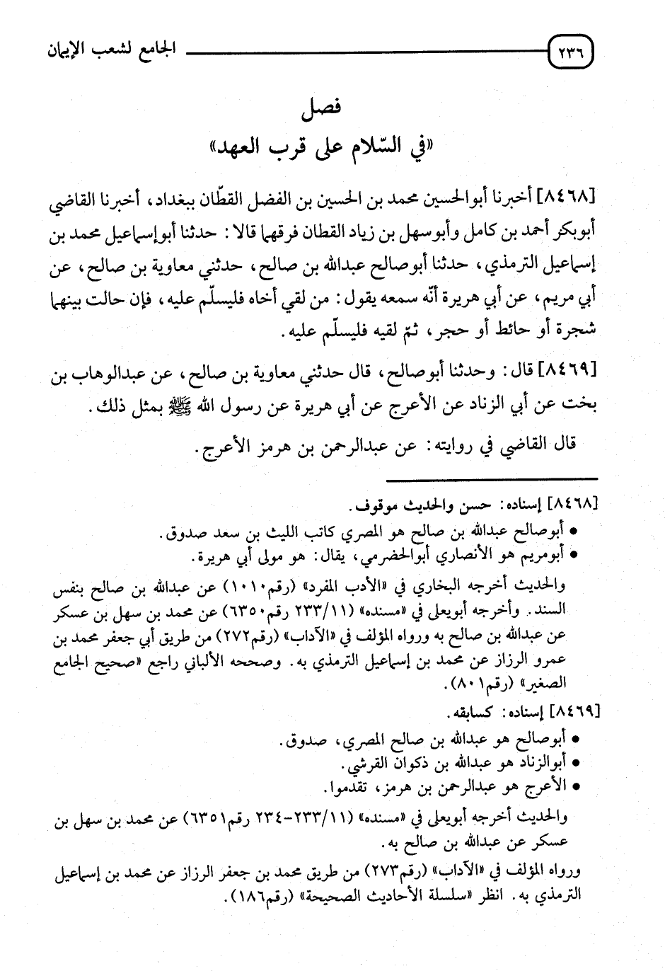 8468 - أَخْبَرَنَا أَبُو الْحُسَيْنِ مُحَمَّدُ بْنُ الْحُسَيْنِ بْنِ الْفَضْلِ الْقَطَّانُ، بِبَغْدَادَ، قَالَ: أنا الْقَاضِي أَبُو بَكْرٍ أَحْمَدُ بْنُ كَامِلٍ، وَأَبُو سَهْلِ بْنُ زِيَادٍ الْقَطَّانُ - فَرَّقَهُمَا -، قَالَا: نا أَبُو إِسْمَاعِيلَ مُحَمَّدٌ التِّرْمِذِيُّ، قَالَ: نا أَبُو صَالِحٍ عَبْدُ اللهِ بْنُ صَالِحٍ، قَالَ: حَدَّثَنِي مُعَاوِيَةُ بْنُ صَالِحٍ، عَنْ أَبِي مَرْيَمَ، عَنْ أَبِي هُرَيْرَةَ، أَنَّهُ سَمِعَهُ يَقُولُ: " §مَنْ لَقِيَ أَخَاهُ فَلْيُسَلِّمْ عَلَيْهِ، فَإِنْ حَالَتْ بَيْنَهُمَا شَجَرَةٌ أَوْ حَائِطٌ أَوْ حَجَرٌ، ثُمَّ لَقِيَهُ فَلْيُسَلِّمْ عَلَيْهِ "