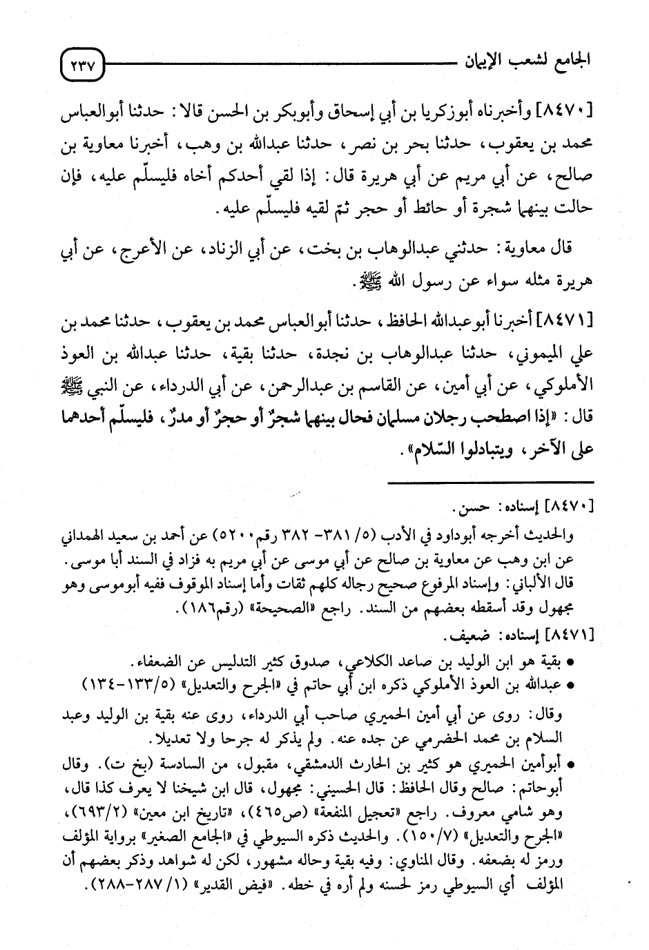 8471 - أَخْبَرَنَا أَبُو عَبْدِ اللهِ الْحَافِظُ، قَالَ: نا أَبُو الْعَبَّاسِ مُحَمَّدُ بْنُ يَعْقُوبَ، قَالَ: نا مُحَمَّدُ بْنُ عَلِيٍّ الْمَيْمُونِيُّ، قَالَ: نا عَبْدُ الْوَهَّابِ بْنُ نَجْدَةَ، قَالَ: نا بَقِيَّةُ، قَالَ: نا عَبْدُ اللهِ بْنُ الْعُوذِ الْأُمْلُوكِيُّ، عَنْ أَبِي أَمِينٍ الْحِمْيَرِيِّ، عَنِ الْقَاسِمِ بْنِ عَبْدِ الرَّحْمَنِ، عَنْ أَبِي الدَّرْدَاءِ، عَنِ النَّبِيِّ صَلَّى اللَّهُ عَلَيْهِ وَسَلَّمَ، قَالَ: §" إِذَا اصْطَحَبَ رَجُلَانِ مُسْلِمَانِ فَحَالَ بَيْنَهُمَا شَجَرٌ وَحَجَرٌ وَمَدَرٌ فَلْيُسَلِّمْ أَحَدُهُمَا عَلَى الْآخِرِ، وَيَتَبَادَلَانِ السَّلَامَ "